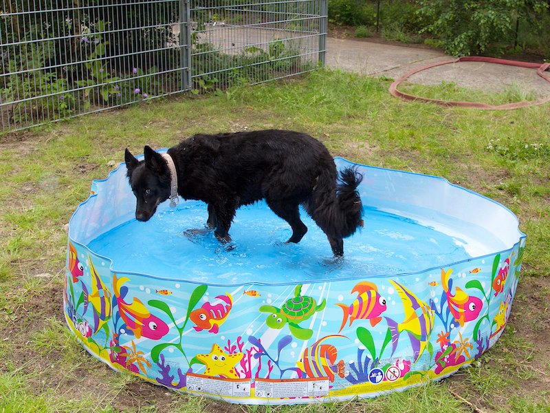 Der Kinderpool auf dem Foto ist leider etwas instabil. Es gibt verstärkte doggy pools für Hunde. Ob uns jemand welche spendiert? Oder solche Bade-Muscheln.
