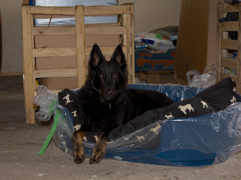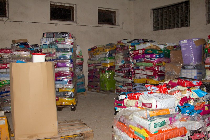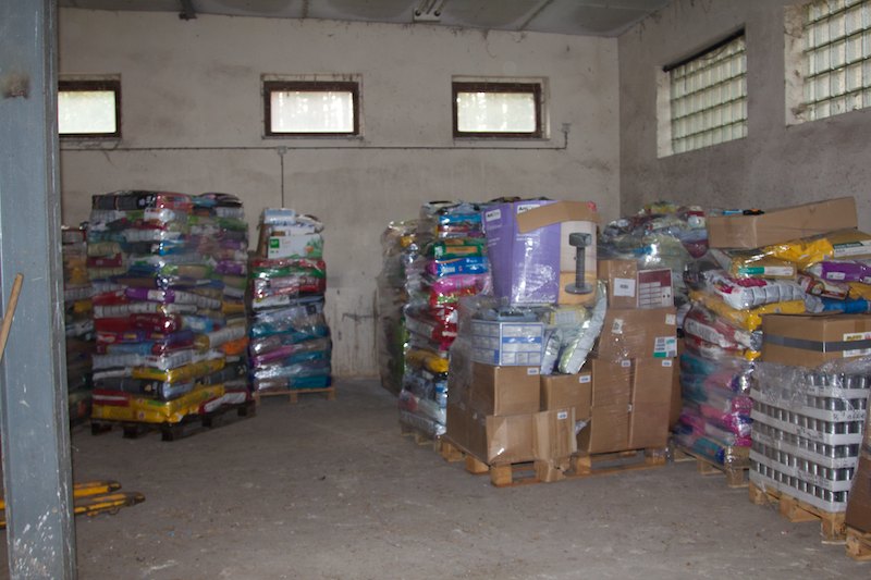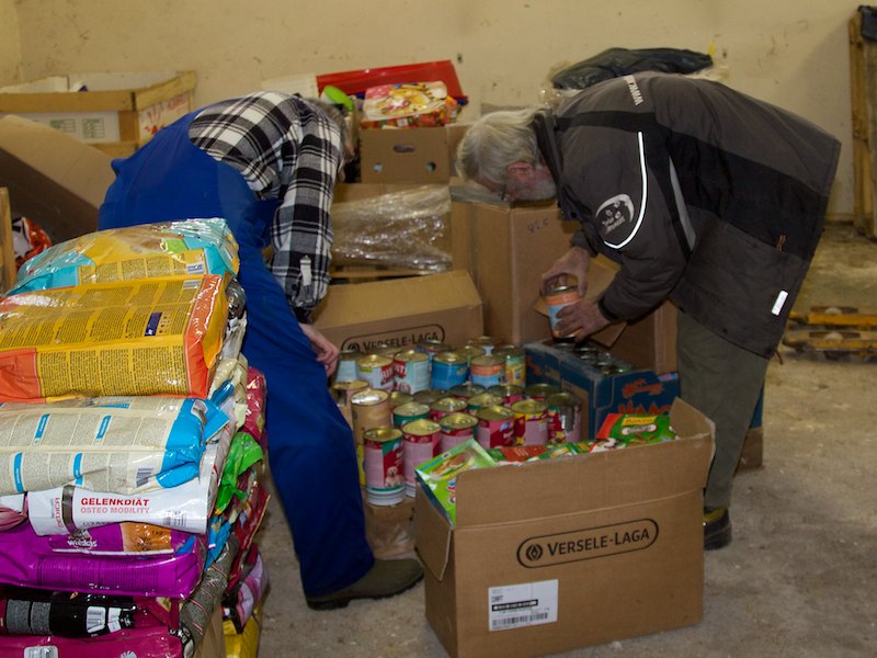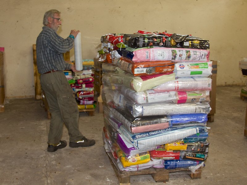22 Tonnen Futter und Sachspenden mussten verpackt werden. Das sind 22.000 kg - eine kaum vorstellbare Menge. In Tüten, kleinen und größeren Paketen, großen Kartons, Säcken usw. war das Futter für die SMEURA bei uns abgegeben worden. Nun musste alles auf Paletten mit der richtigen Höhe zusammengepackt und rutschsicher eingestrecht werden. Ein echter Knochenjob. Und alles unter strenger Aufsicht von Hündin Joesi und Kätzin Saphira.