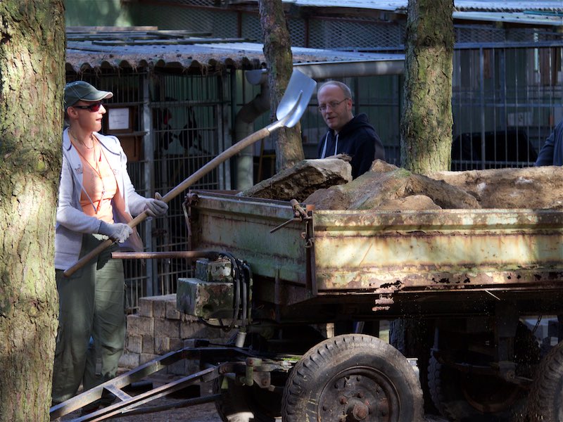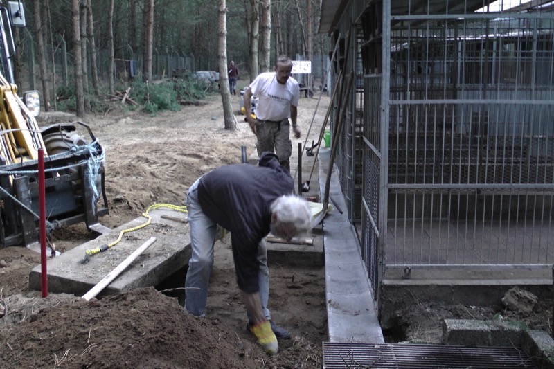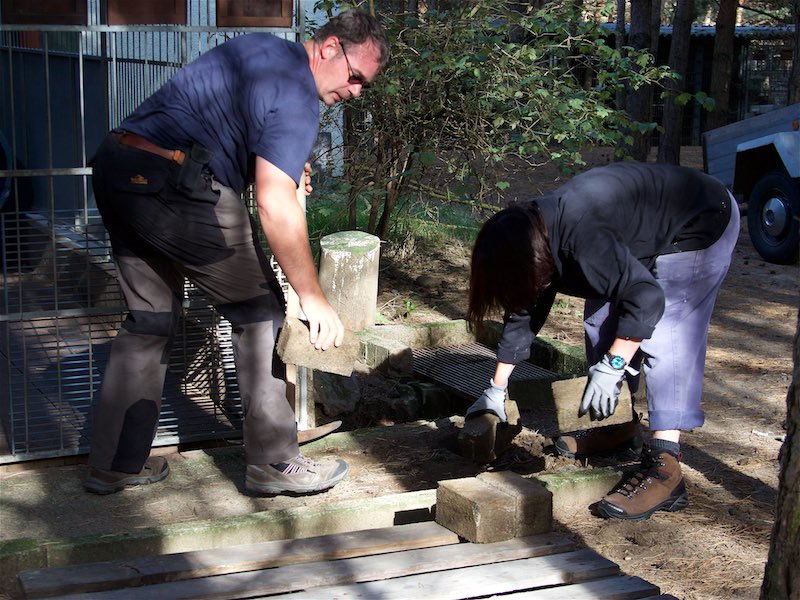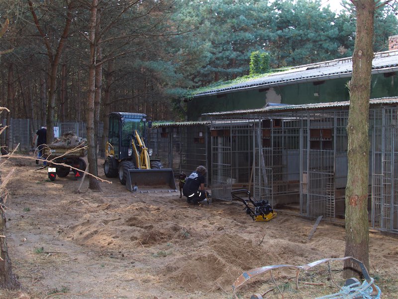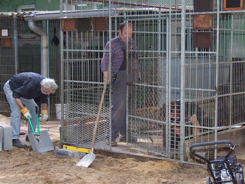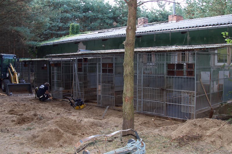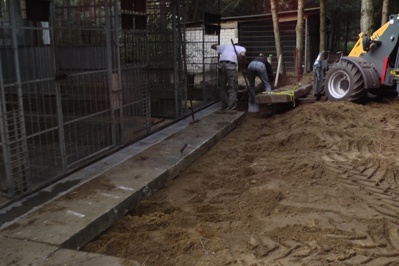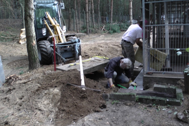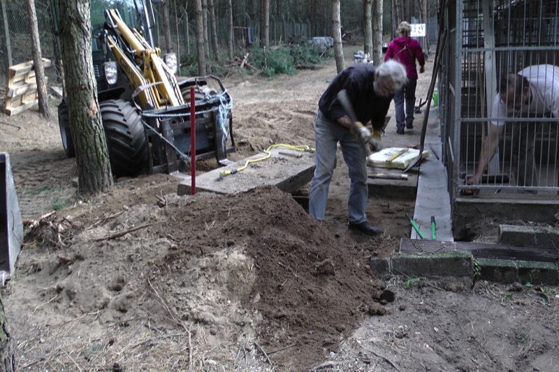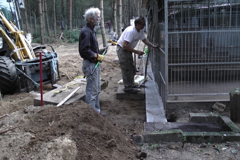 Die Fällarbeiten und Stubbenrodungen waren schon anstrengend genug, aber der Härtetest waren die Betonplatten. In den Zwingern mussten teilweise die Böden getauscht werden. Die Wasserrinnen waren auf ganzer Länge marode und mussten erneuert werden. Der Untergrund musste geebnet und verdichtet werden - und dann die zentnerschweren Platten wieder neu verlegt werden.
