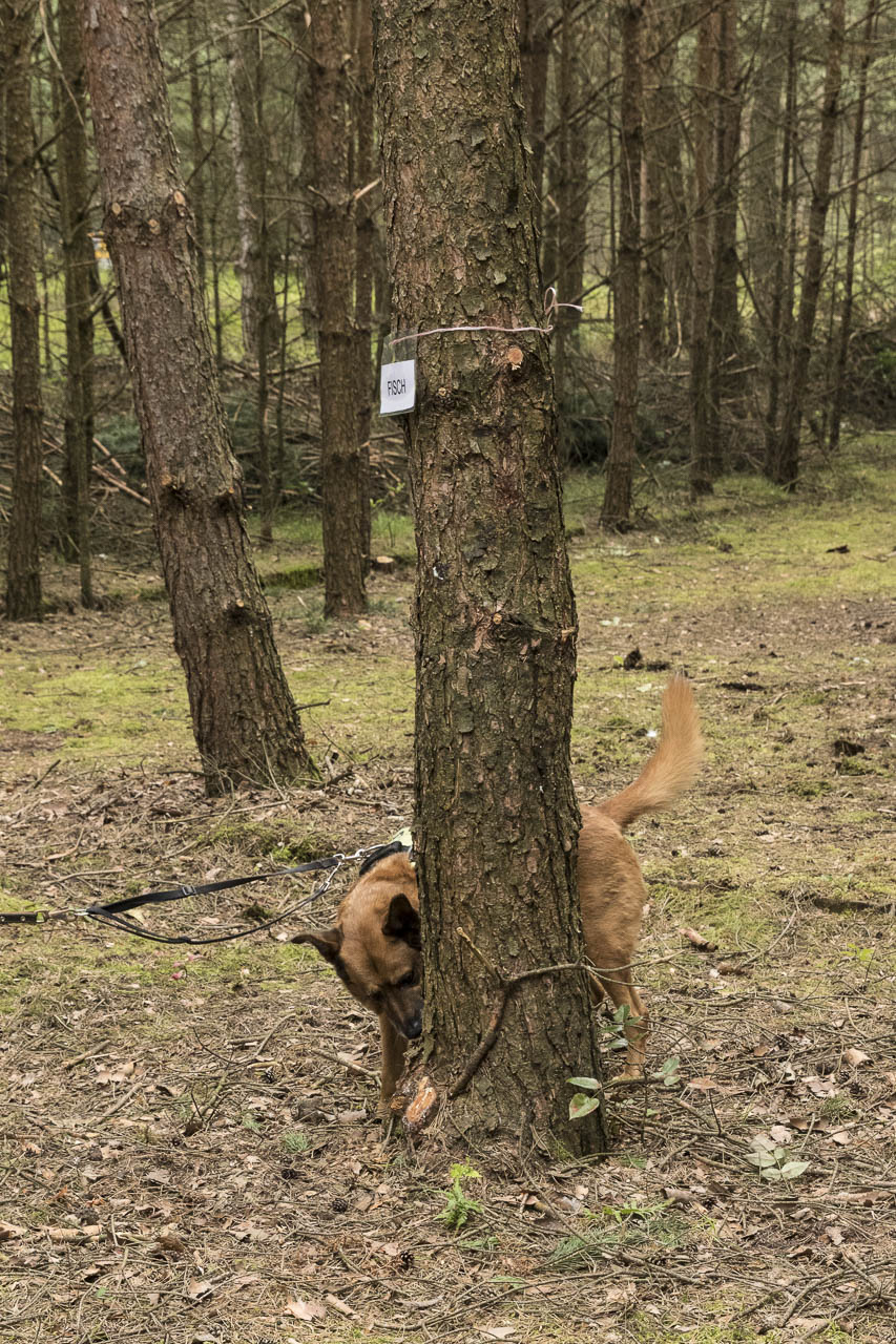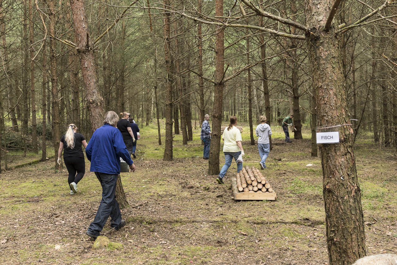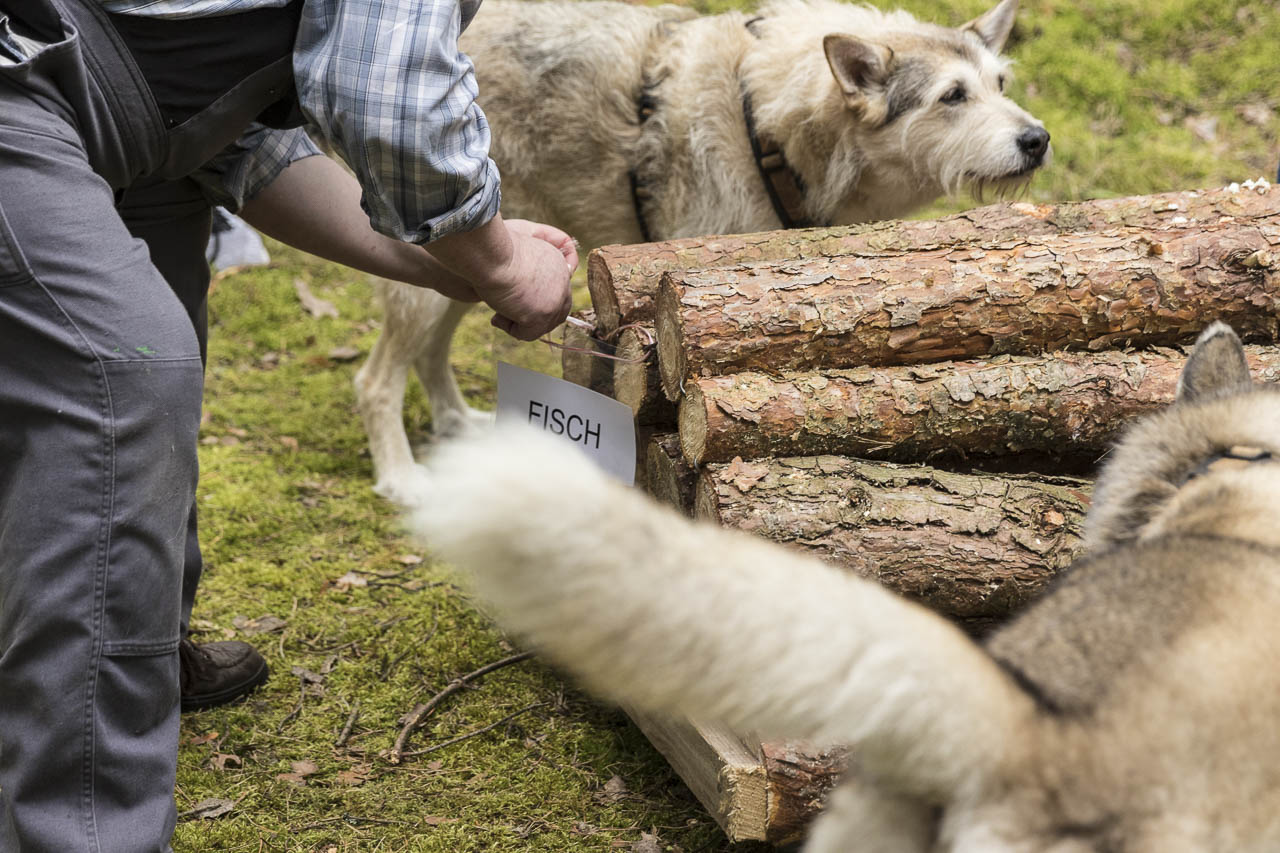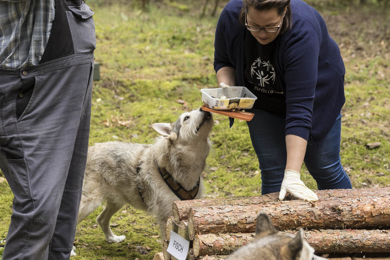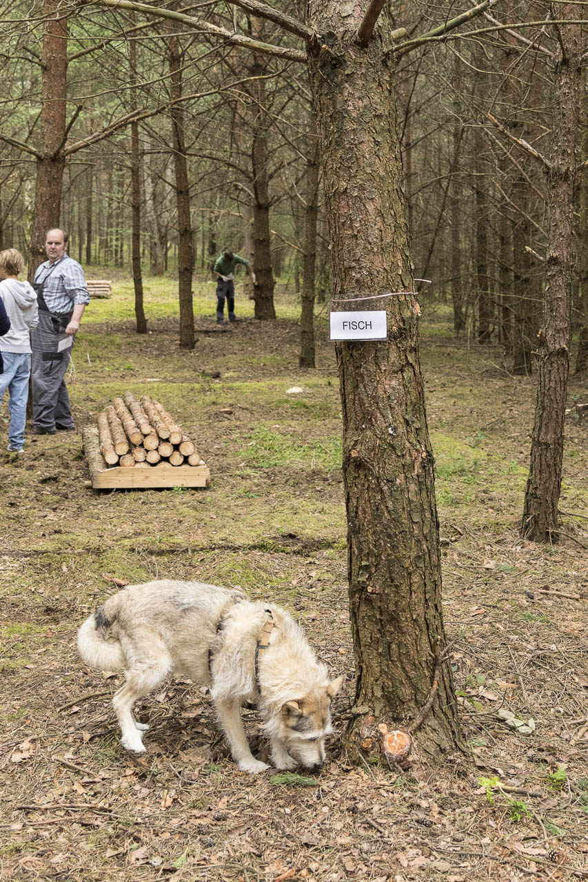 Zuvor hatten wir einige Bäume mit herrlich stinkenden Aromen "parfümiert": Kot von Wild, Schaf und Schwein, Katzenfutter, Schafwolle, Pansen und alter Fisch. Dieser kam besonders gut an. Die Bäume haben wir beschriftet, damit unsere Mitarbeiter wissen, wo neu aromatisiert werden muss, denn die Gerüche werden sich ja verflüchtigen.