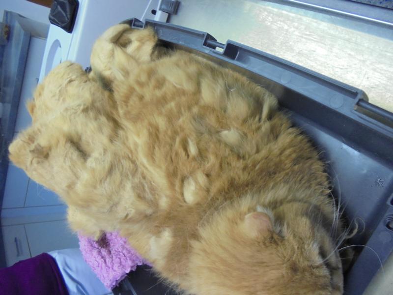 Da ihr Frauchen selbst pflegebedürftig war, konnte sie die Katze nicht mehr pflegen. Das Ergebnis war ein so stark verfilztes Fell, dass es schon fast so hart wie Beton war. In Platten hing es am Körper - teilweise so groß wie Frühstücksteller. Vermutlich litt sie starke Schmerzen an der Haut.
