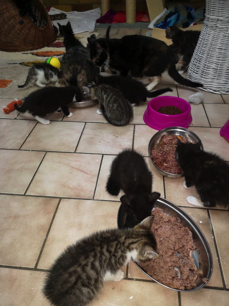 Es sind alles Nachkommen von Straßenkatzen. Manche tragen deshalb einiges an Krankheitserregern in sich. Da ihr Immunsystem noch nicht ausgebildet ist, müssen wir noch eine Weile zittern. Manche der Minis wurden uns sogar ganz ohne ihre Mütter gebracht, da diese tot gefahren wurden. Sie haben es besonders schwer. Aber wir geben unser Bestes.