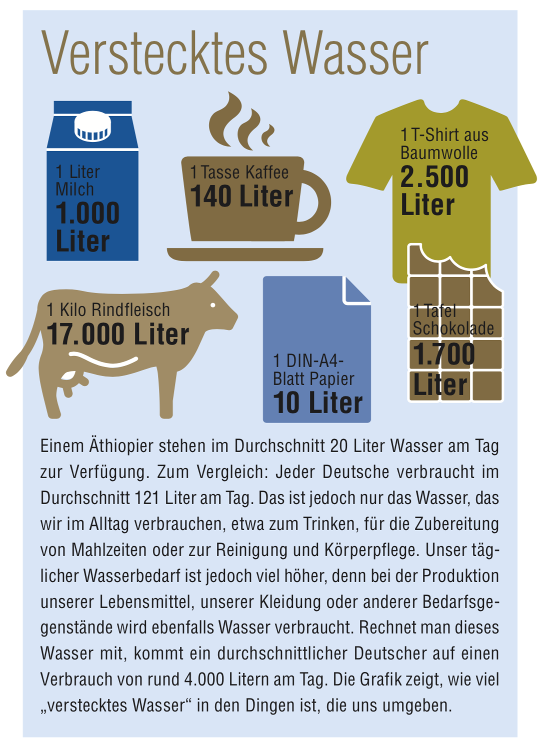 Jetzt stießen wir auf eine interessante Grafik, die wir dem NAGAYA-Magazin der Stiftung "Menschen für Menschen" entnommen haben. Dort wird der versteckte Wasserverbrauch dargestellt. 17.000 Liter für ein einziges Kilogramm Rindfleisch! Diese Zahlen sind schon erschreckend.