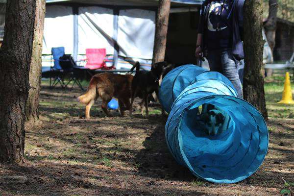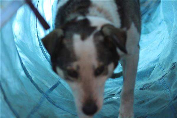 Eine Ehrenamtlerin spielte mit ihm auf unserem Schnüffelparcours. Dort entdeckte Sammy den Tunnel und marschierte sofort wie ein alter Hase hindurch.