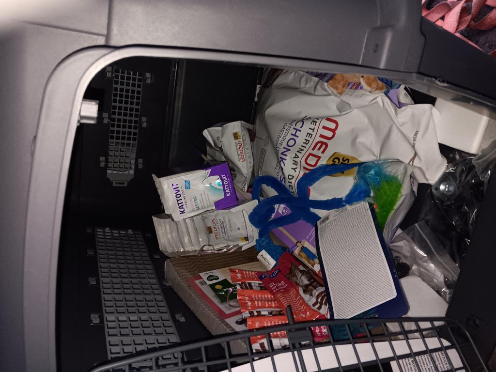 Tatsächlich kam die Dame und erfüllte alle unsere Wünsche: das teure Spezialfutter für Hunde und Katzen, Kittenfutter und noch Körbchen obendrauf und Liegekissen und Katzentoiletten und Kausnacks und Schlafschalen ... Über 600 € blätterte sie dafür hin.