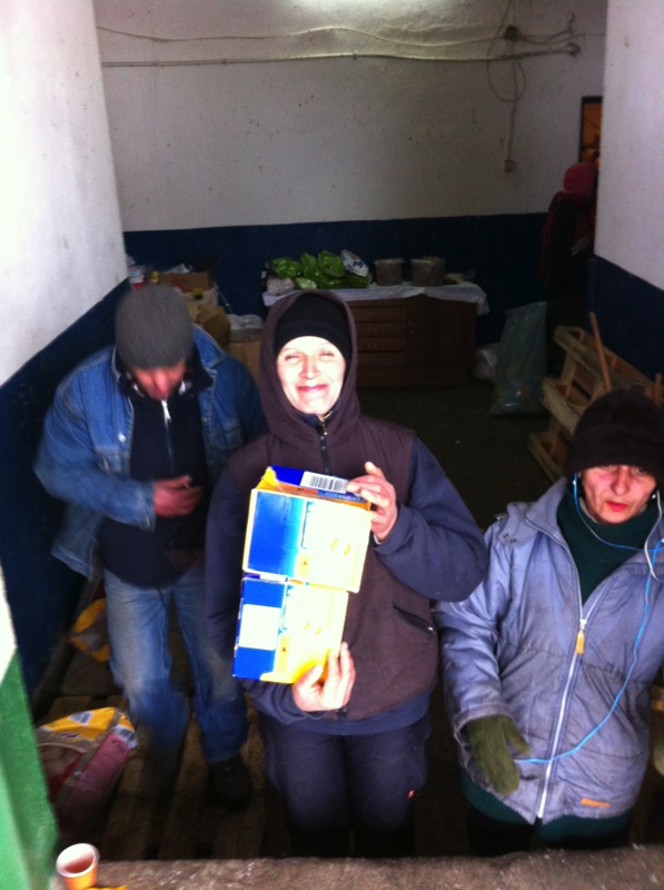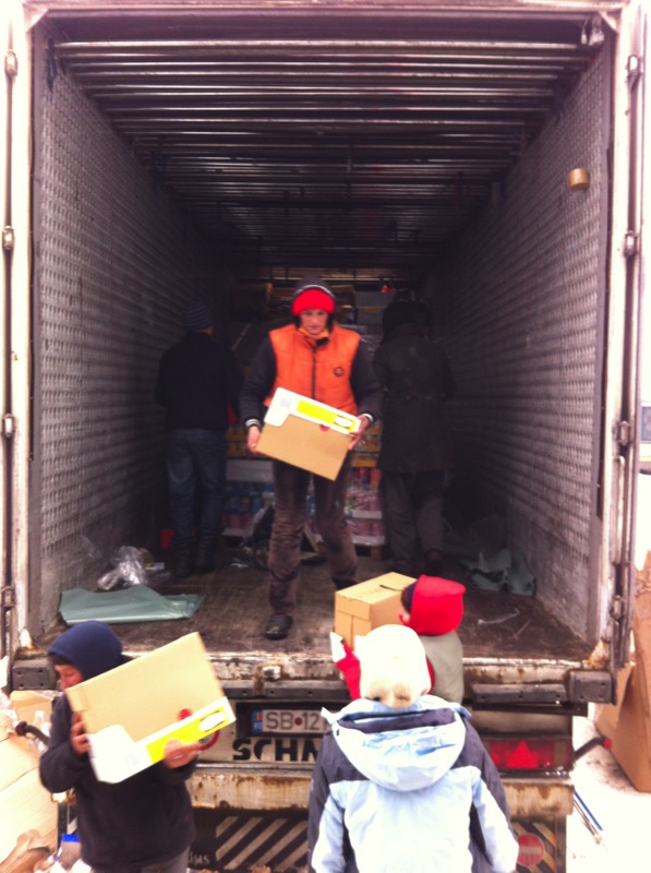 Die Mitarbeiter mussten leider alles von Hand abladen, denn aufgrund des Schnees konnte der Gapelstapler nicht fahren. Er sprang bei den Minustemperaturen auch gar nicht erst an.