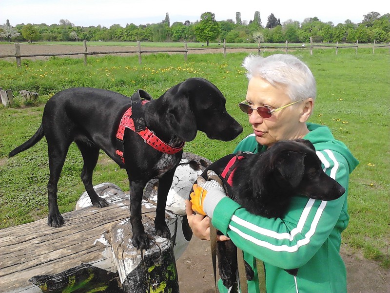 "Hallo liebe Tierheimmenschen, vorgestern ist Mimi zu uns gekommen und ich wollt kurz mitteilen, dass es ihr sehr gut geht. Heute morgen waren wir in der Domäne Dahlem spazieren und Mimi war zu allen Schandtaten bereit. Die 10 m Laufleine verhinderte gerade noch ihren direkten Besuch bei den Kühen, Schweinen und Schafen. Sie frisst und schläft gut, wie es sich gehört verrichtet sie ihr Geschäft draußen. Cleo schläft im Mimis und Mimi in Cleos Bett. So muss es wohl sein.
