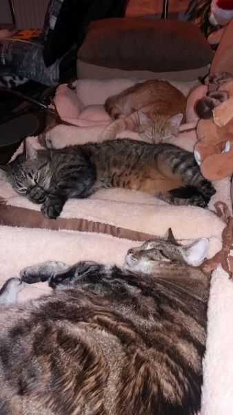 "Hallo, heute war mein 1. Arbeitstag nach meinem Urlaub. Die drei haben heute früh ganz schön traurig geguckt. Aber jetzt zu Hause endlich war grosse Freude angesagt. Haben alle drei geschlafen. Und jetzt wird gegessen." (Bild 5)