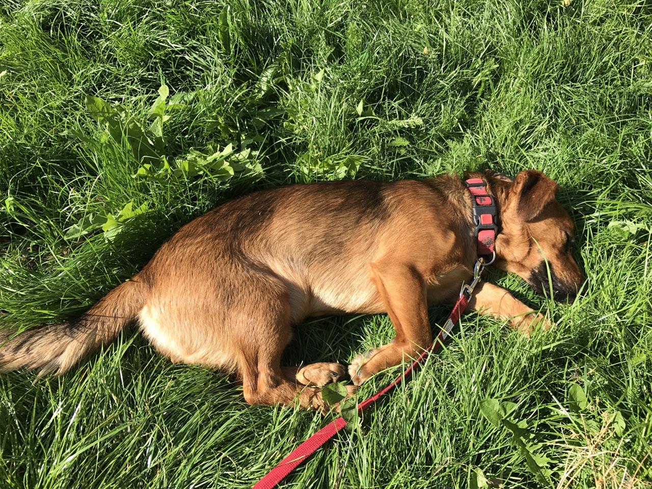 Nachdem der erste Tag nahezu apathisch an ihm vorüber gegangen war vor Angst taut er langsam auf und kommt freiwillig her. Stubenrein passt perfekt, fressen auch, die Verteilung der Körbe ist geregelt und das Einleben hat begonnen. Ach ja, er liebt es im Gras zu liegen.