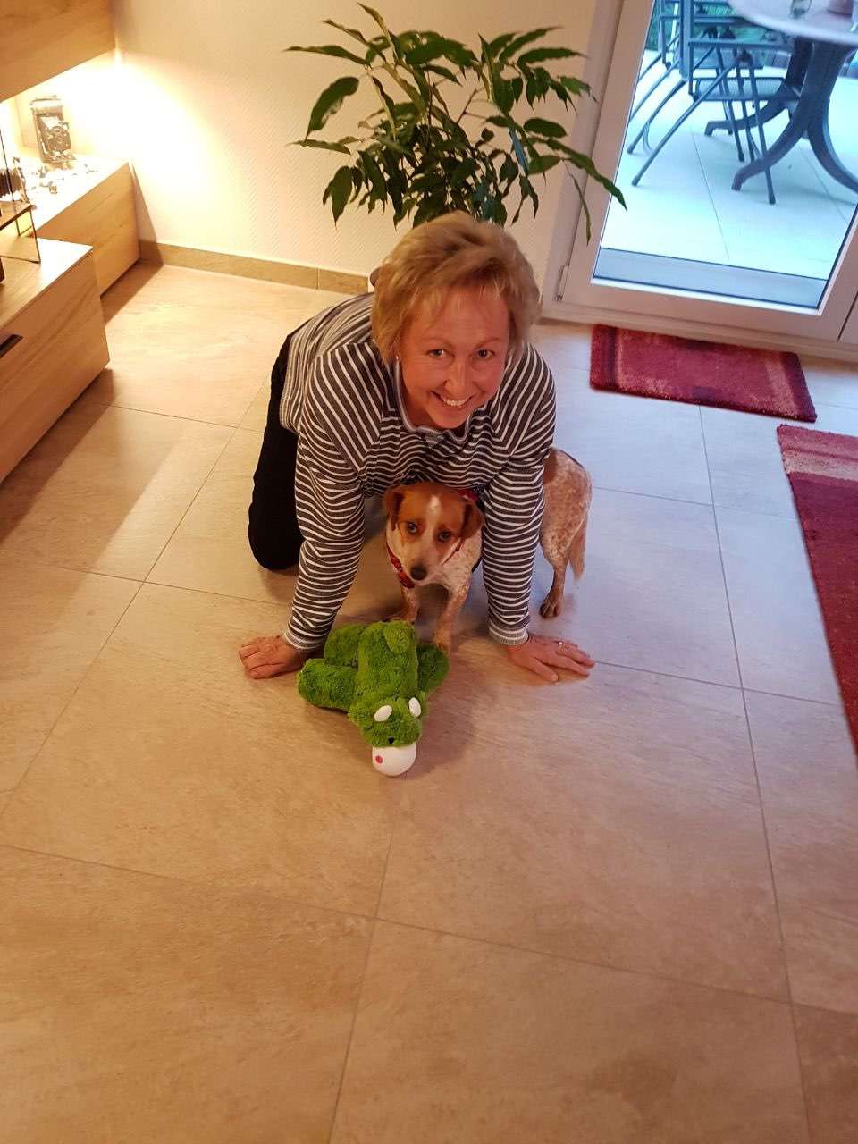 Oftmals bin ich nach dem Gassi gehen so aufgedreht und tobe dann mit meine Leuten im Garten. Ich werde viel gelobt und werde auch immer lockerer.