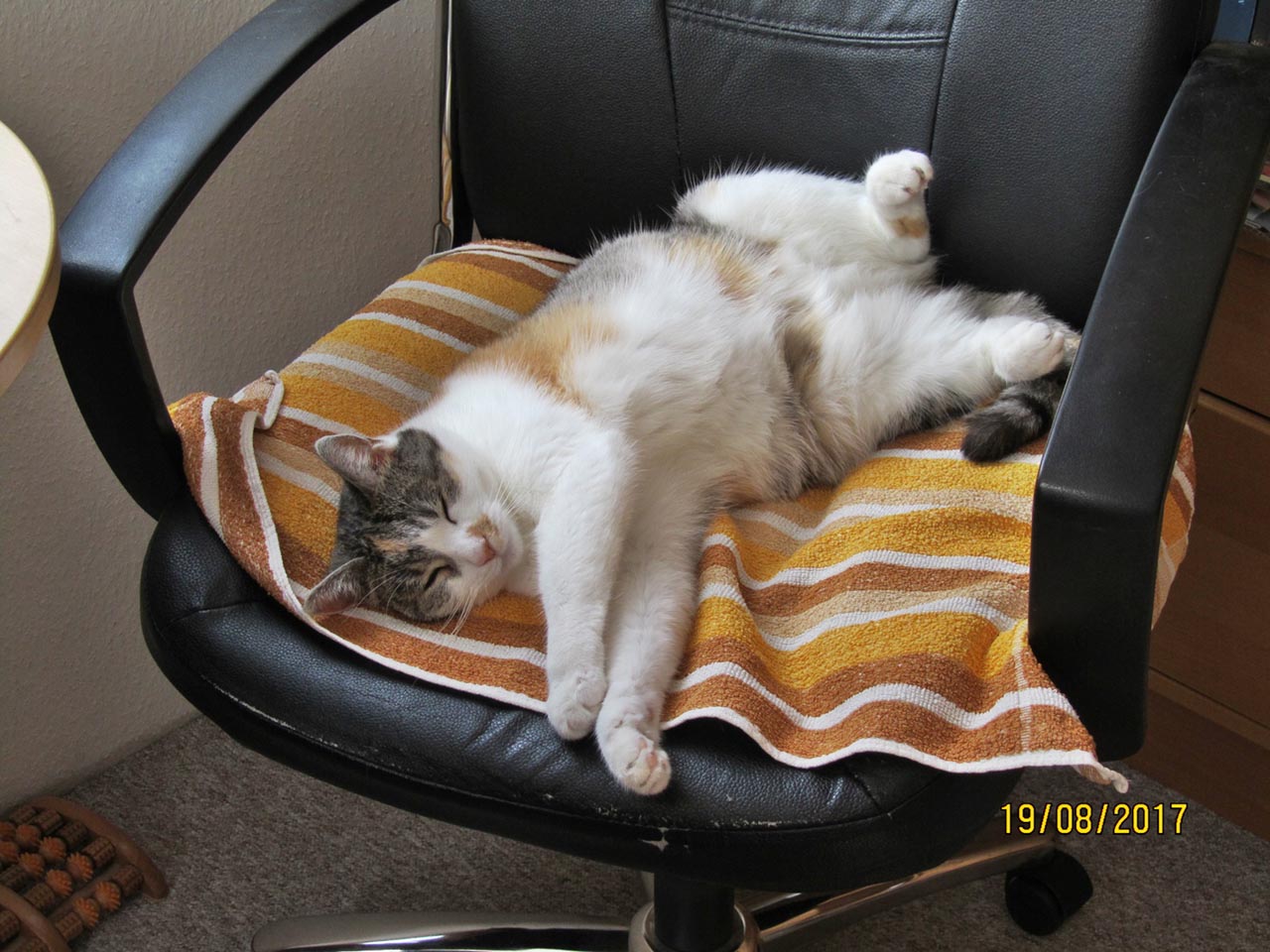Ende Oktober habe ich meine Ausflüge in die freie Natur so langsam eingestellt, es wurde mir zu kalt. Außerdem habe ich im Haus viele schöne Schlafplätze wo ich „überwintern“ kann. Sonst geht es mir gut: ich werde mit bestem Futter, Leckerchen und Streicheleinheiten (wenn ich es möchte) verwöhnt.