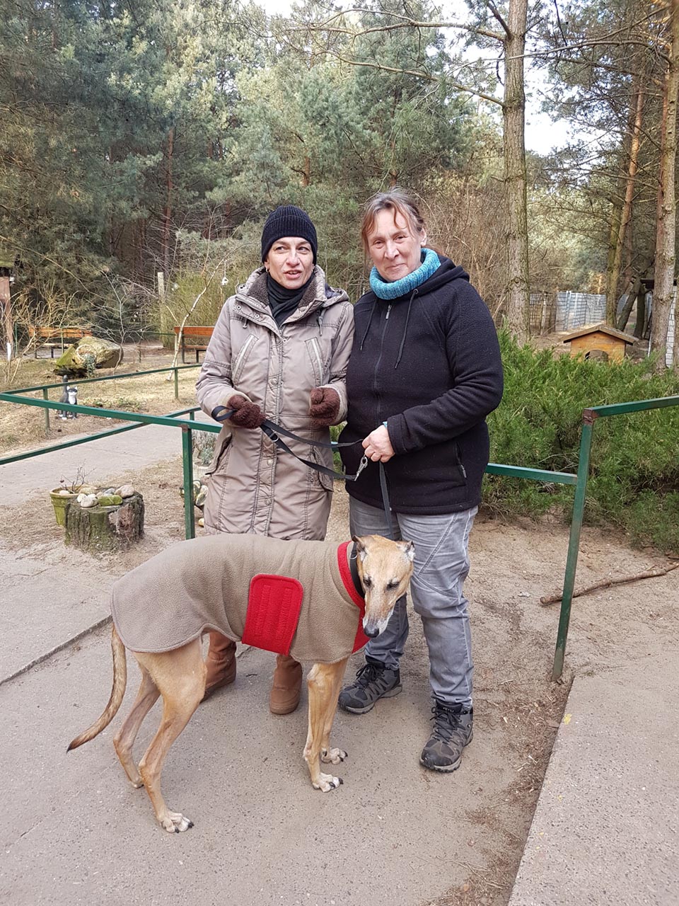 Tierpflegerin Gabi (rechts im Bild) ist wie alle unsere Mitarbeiter sehr froh, Ehemalige so gut behütet wiederzusehen.