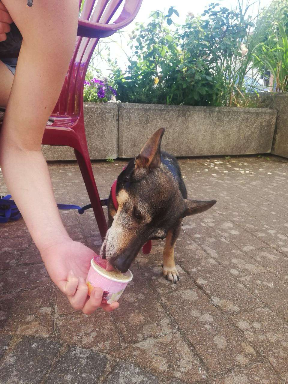 Dieses Jahr hat er im Sommer das erste Mal Hundeeis probiert- ohne Becher halten war das Schlecken aber zu anstrengend… Naja, einem Hunderentner lassen wir seine Faulheit gerne durchgehen!