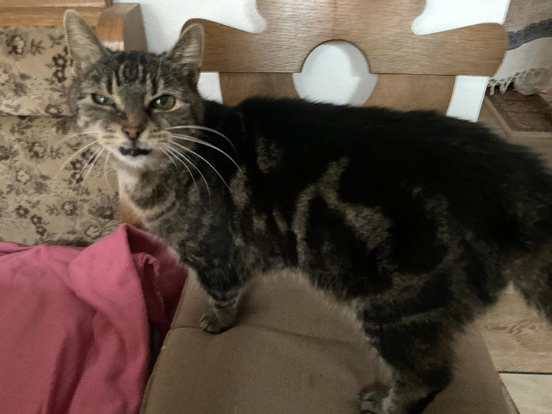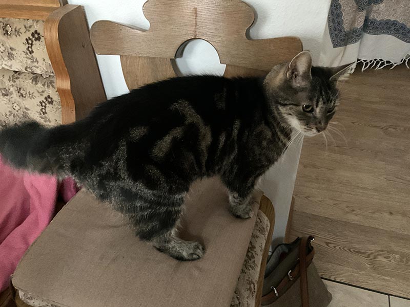 Wir haben noch einen jungen Kater, der in der Corona-Zeit angeschafft und als er anfing zu markieren, ausgesetzt wurde. Er gehörte niemandem, eine Frau hatte ihn gefüttert und sich mit ihm beschäftigt. Sie konnte ihn leider nicht aufnehmen.