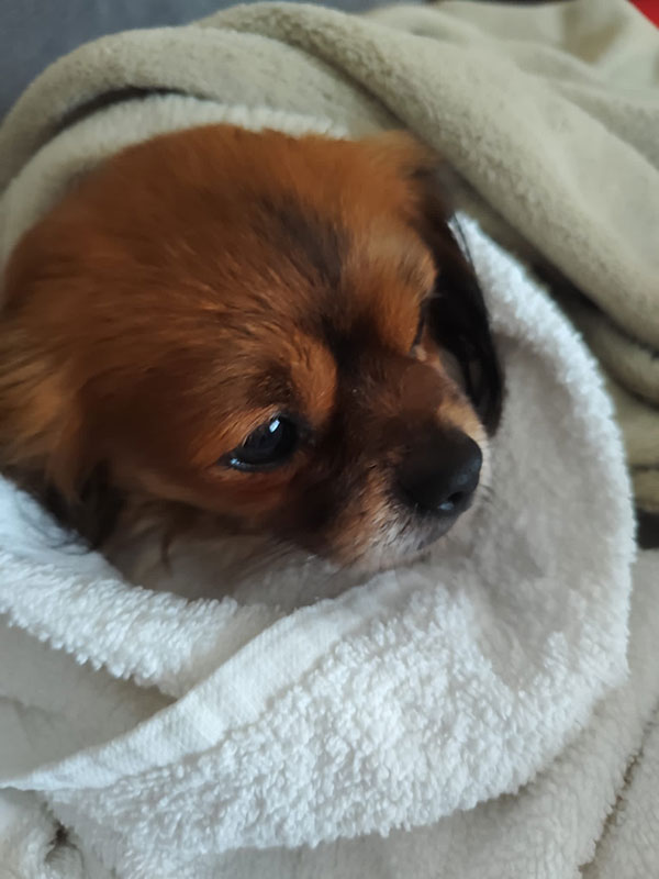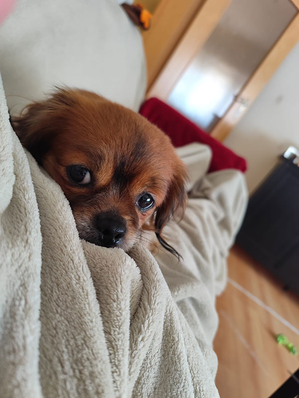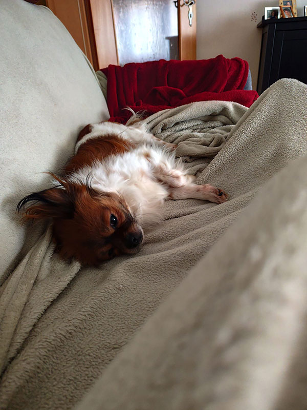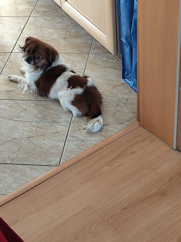 Ich kann meinem Frauchen sogar schon zeigen, wann ich pulvern möchte. Ich darf auch bei meinem Frauchen auf der Couch schlafen, auf ihrem Bauch, das mag ich sehr,