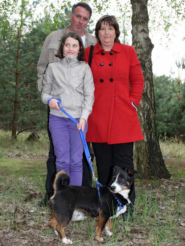 Nachdem Thekla die neue Familie bei Gassitouren ausführlich auf Tauglichkeit als neue Spielgefährten getestet hatte, kletterte sie sofort auf den Schoß des Kindes, denn das ging ganz lieb mit ihr um.