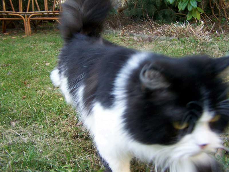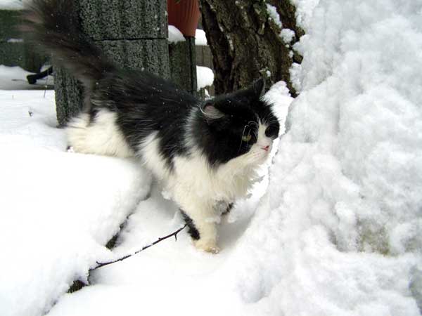 Leopold musste dieses komische weiße Zeug mal genauer betrachten, dreht gern auch so 10 Minuten seine Runde, zieht es aber dann doch vor von drinnen zu schauen.