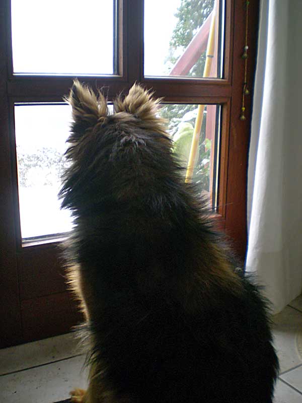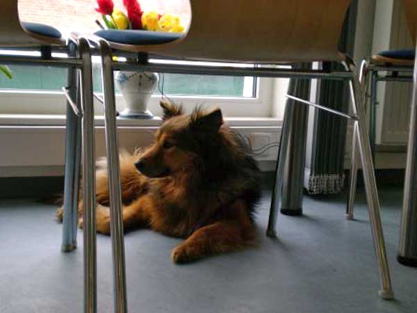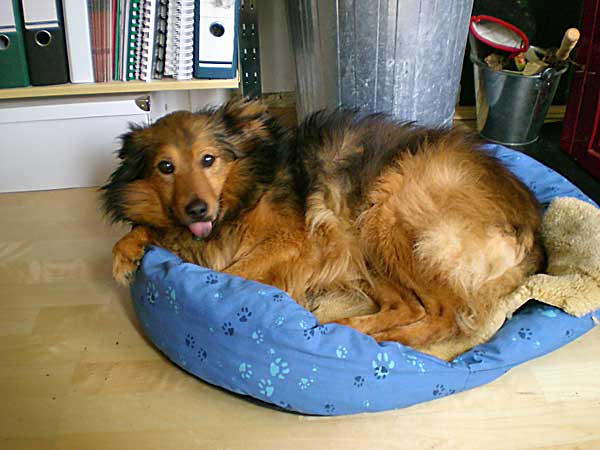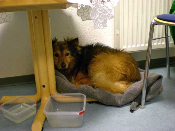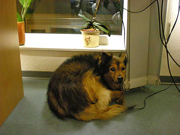 Dann schlafe ich - das mache ich am liebsten. So um 9 Uhr, wenn die ersten Menschen die Pause machen, werde ich auch aktiv. Pause für den Mensch heißt für mich aufpassen, dass etwas runterfällt oder ganz lieb auf das Wurstbrot schauen, geht nur wenn mein Mensch nicht in der Nähe ist.