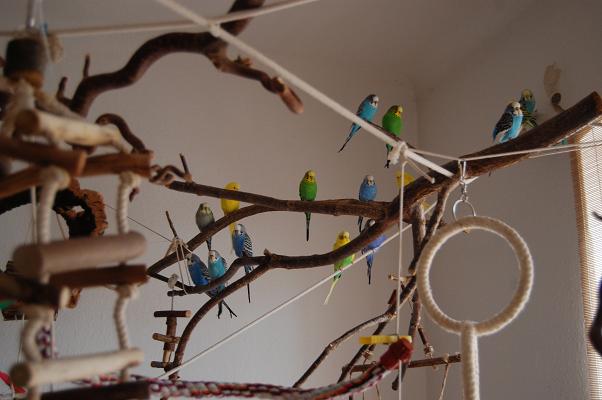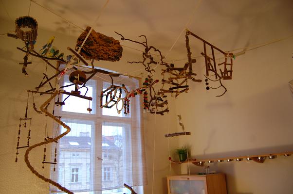 Ich für meinen Teil habe es mit meinem neuen Schwarm und den Federlosen hier toll getroffen. Wir haben ein ganzes Zimmer nur für uns, in dem wir den ganzen Tag Dummheiten anstellen dürfen. Ich kann hier fliegen, spielen, klettern und fressen wann immer ich Lust dazu habe. Am liebsten mache ich das natürlich zusammen mit den anderen.