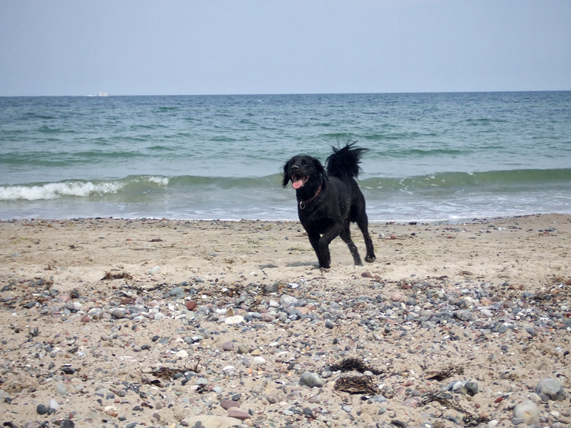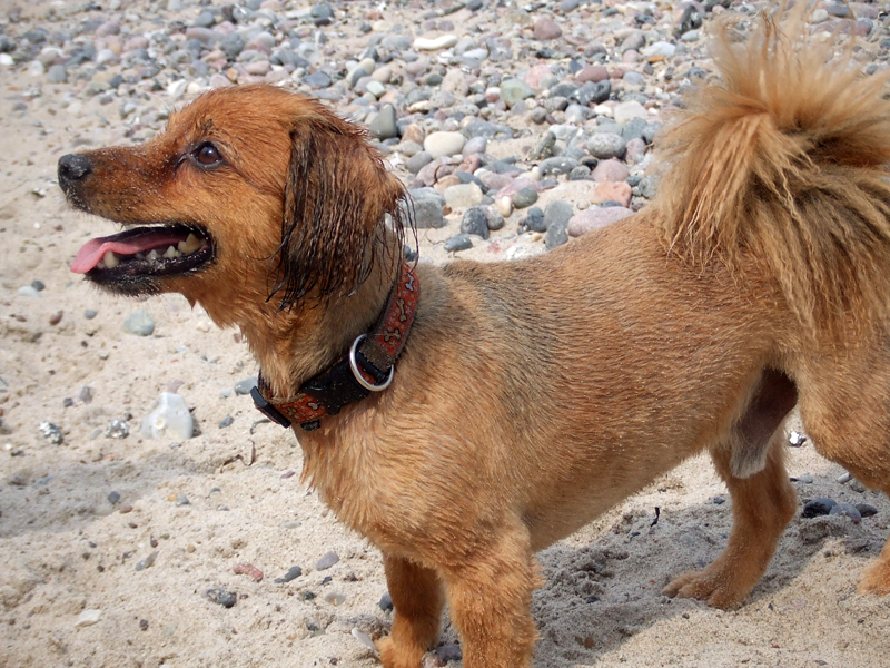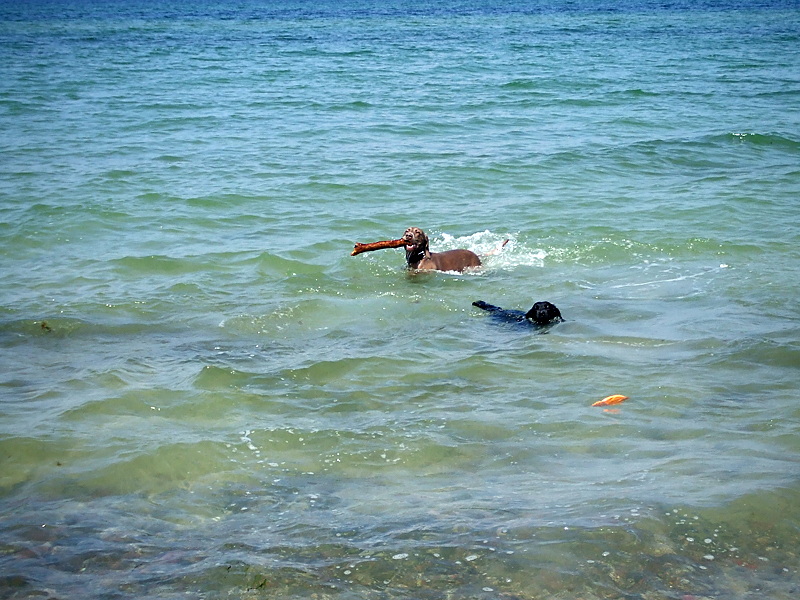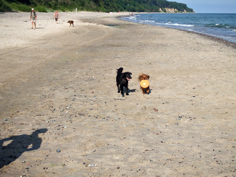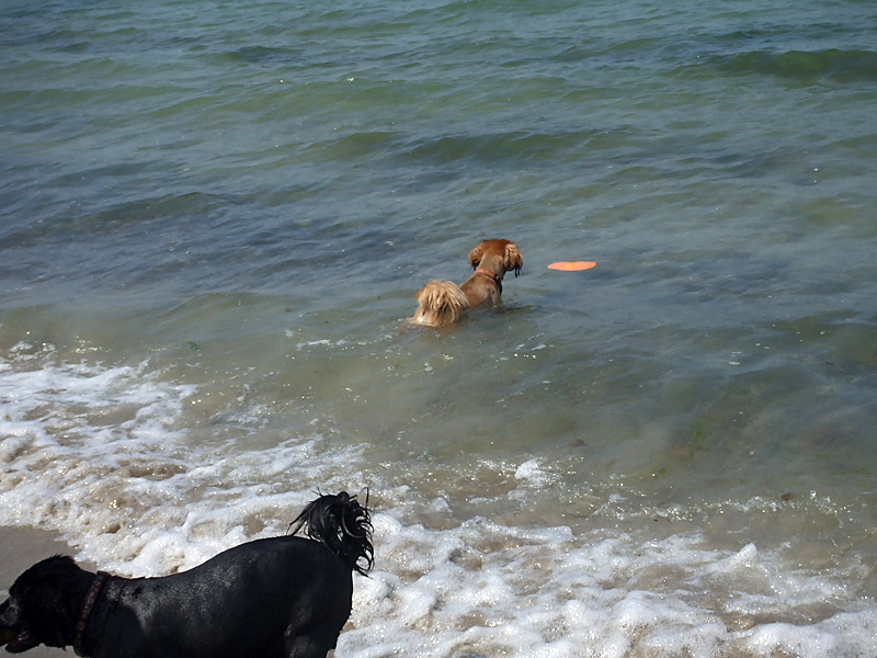 anbei schicken wir euch ein paar Bilder von Teddy und Amigo. Wir waren mit den beiden an der Ostsee zum spielen und zum baden. Amigo war den lieben langen Tag im Wasser und hat den Stock oder die Frisbee "gerettet". Das Wasser ist sein Element, er taucht und er springt in die Fluten, das macht ihm alles nichts aus. Der Kleine Teddy hat immer am Strand gewartet. Aber bis zum Bauch ist er auch reingegangen, doch die Wellen waren leider größer als er, sodass er auch am ganzen Körper nass wurde. Mit den anderen Hunden am Hundestrand haben sie sich prima verstanden. Letztendlich haben die beiden sich für gar keinen anderen Hund interessiert, die beiden wollten einfach nur spielen, bis Frauchen und Herrchen die Arme abgefallen sind vom ganzen Stock oder Frisbee werfen. Abends mussten wir die beiden dann nach Hause tragen, weil sie einfach nicht mehr konnten und die Müdigkeit endlich durchkam.