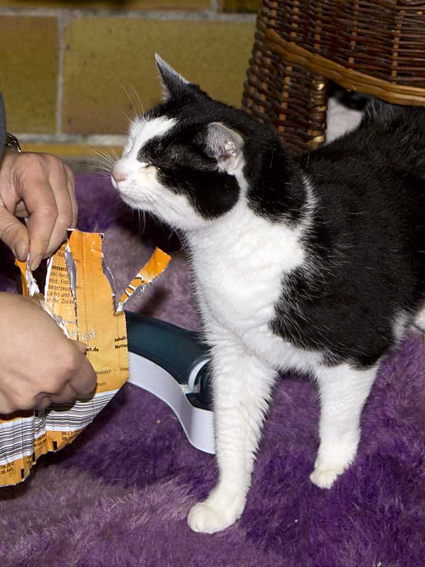 Pünktchen lässt sich nun in ihrem neuen Zuhause mit Leckerchen verwöhnen...