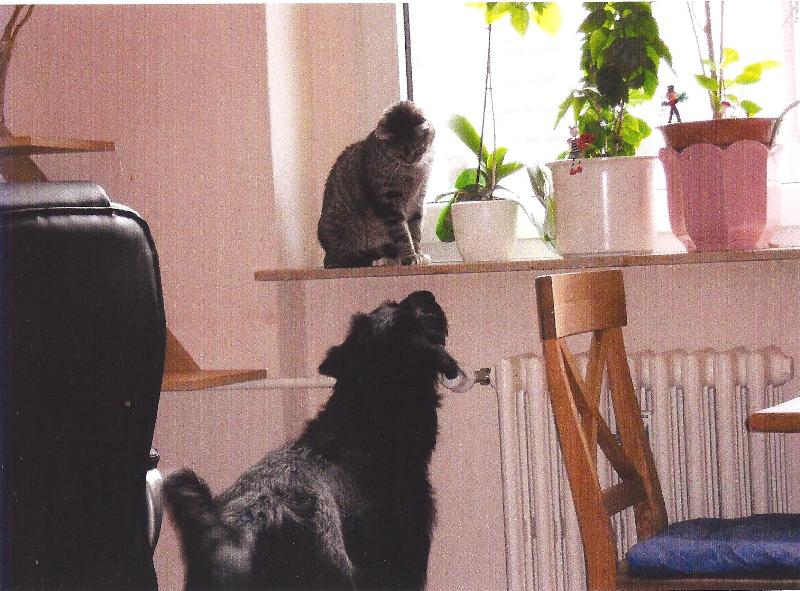 Er hat mittlerweile zwei Hundefreundinnen und die liebste davon ist Bella auf dem beigefügten Bild. Da die beiden ungefähr ein Alter haben, geht sobald sie sich sehen die wilde Jagd los bis man sich erschöpft niederlegt.