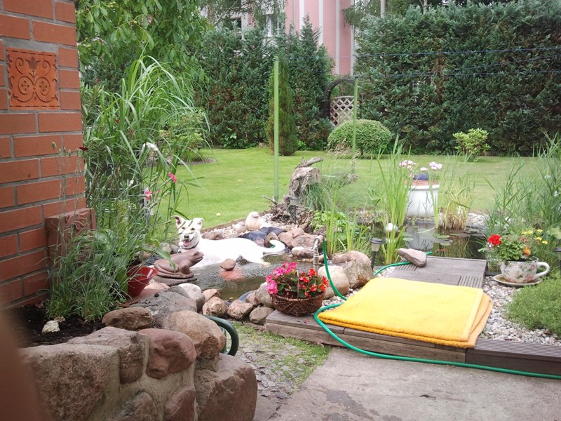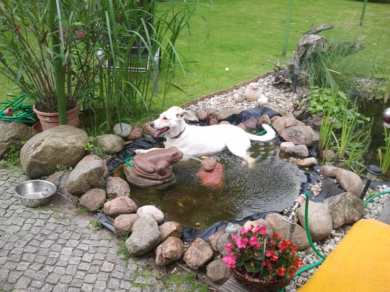nach doch langer Zeit mal wieder ein paar Grüße von uns (Donna und ihr Rudel). Unserer Donna geht´s (wie man sieht) super, sie ist absolut zu Hause und "bewacht" ;-) sogar schonc"ihr Grundstück". Wenn wir im Garten sitzen und die Post oder Besuch kommt, müssen die schon gar nicht mehr klingeln - Donna bekommt das schon vorher mit und meldet sofort. Hier auf den Bildern ruht sie sich gerade von ihrem üblichen sehr langen Sonntagsspaziergang aus. Den kleinen Teich hat sie vom ersten Tag an als den ihren erklärt. Wir haben mit Erstaunen festgestellt, dass unsere Prinzessin nun schon seit dem 04.07.09 bei uns ist und würden sie um nichts in der Welt wieder hergeben. Ab nächste Woche ist Urlaub und da hat sie uns 14 Tage lang jede Stunde für sich und das nutzt sie auch. Jeden Tag baden und stundenlange Spaziergänge durch den Wald. Wir haben das praktisch im Spreewald vor der Haustür und sie liebt diesen Ort und unseren Nachbarshund - ein stattlicher Labi-Rüde. Donna ist nun auch ein Bürohund geworden, - sie darf mich öfters zur Arbeit begleiten und verhält sich auch bei Kundenverkehr vorbildlich. So dies in Kürze. Ich wünsche Ihnen und Ihren Mitarbeitern weiterhin Erfolg in der Vermittlung Ihrer Vierbeiner, mögen sie alle ein schönes Zuhause finden.