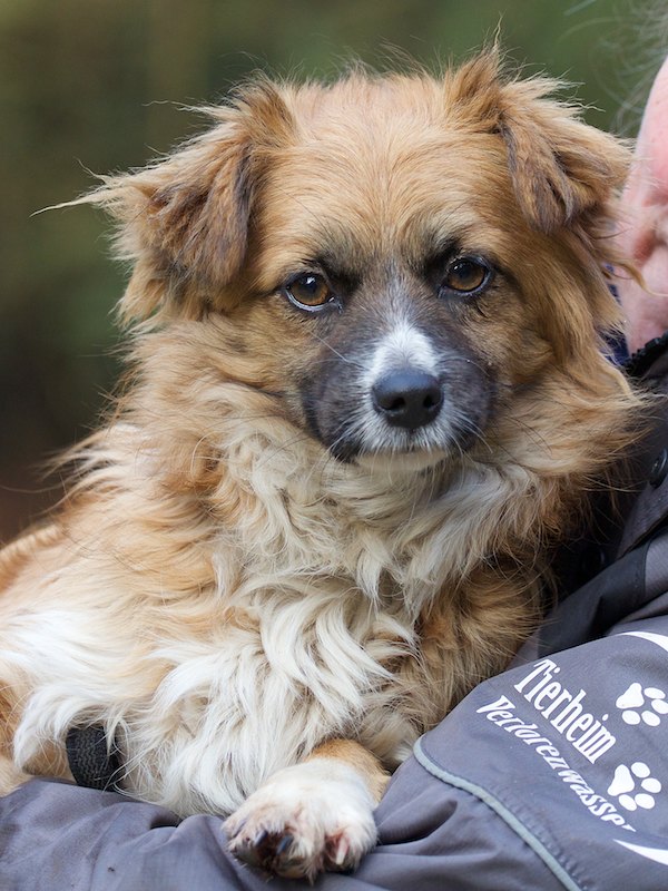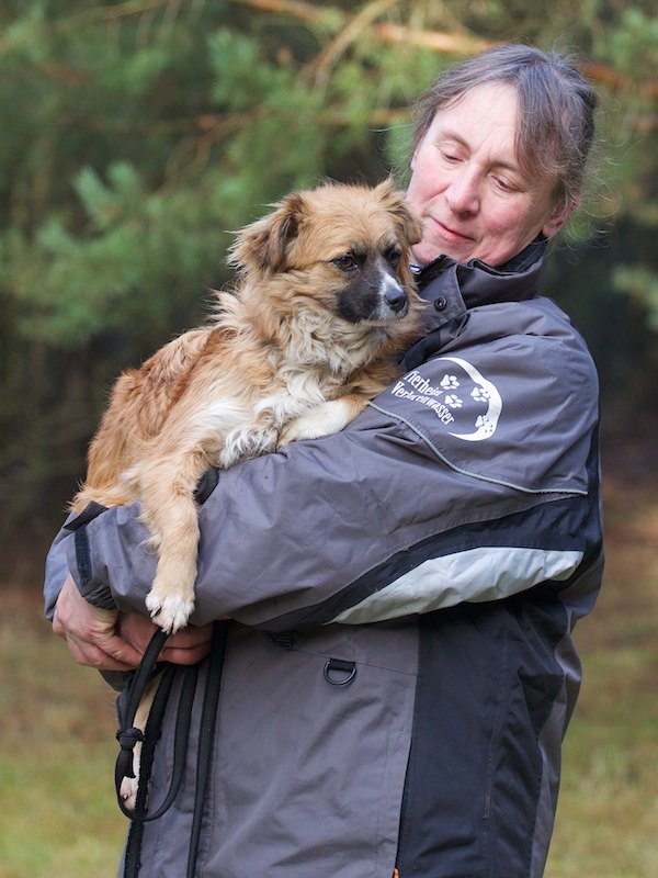 Die anhängliche und unkomplizierte kleine Hündin wird nun in Berlin beschmust.