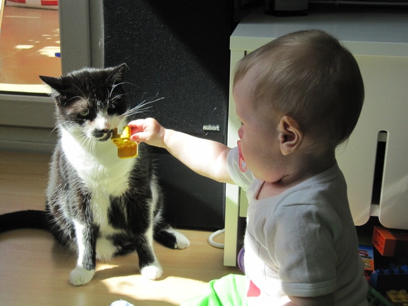 Zu dieser Zeit war bei uns bereits Nachwuchs unterwegs und auch wenn Elli das Baby erst mal sehr kritisch betrachtet hat - immerhin war es manchmal ganz schön laut - so war sie von unseren 2 Katzen diejenige, die inzwischen sogar von unserer Tochter gestreichelt werden durfte und nicht die Flucht ergriff, wenn unser Wirbelwind sich vor Freude jauchzend "auf sie stürzte".