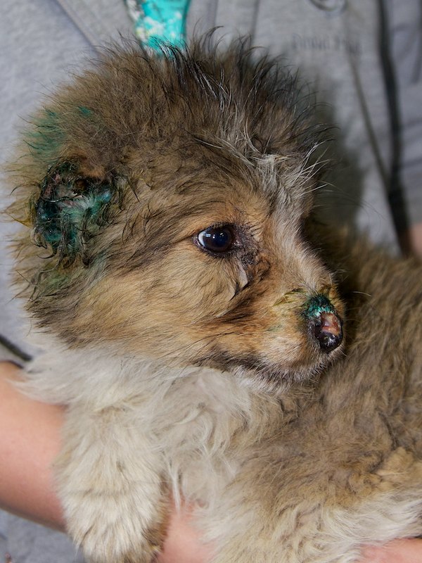 Ganz hinten in der äußersten Ecke saß ein kleines Welpenmädchen in einer Gitterbox - ein einziges Häufchen Elend. Es hieß, sie hätte einen Unfall gehabt. Beim Herausnehmen sah ich das ganze Ausmaß ihrer schlimmen Verletzungen: Von den Ohren war nur noch die Hälfte vorhanden und in der Nase hatte sie ein Loch. Sie ist erst drei, vier Monate alt und hat in ihrem kurzem Leben schon so viel Schreckliches erleben müssen?