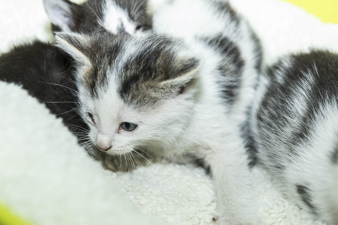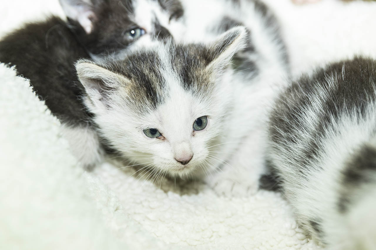 Das grau-weiße Kitten mit den helleren Öhrchen ist ein Junge.