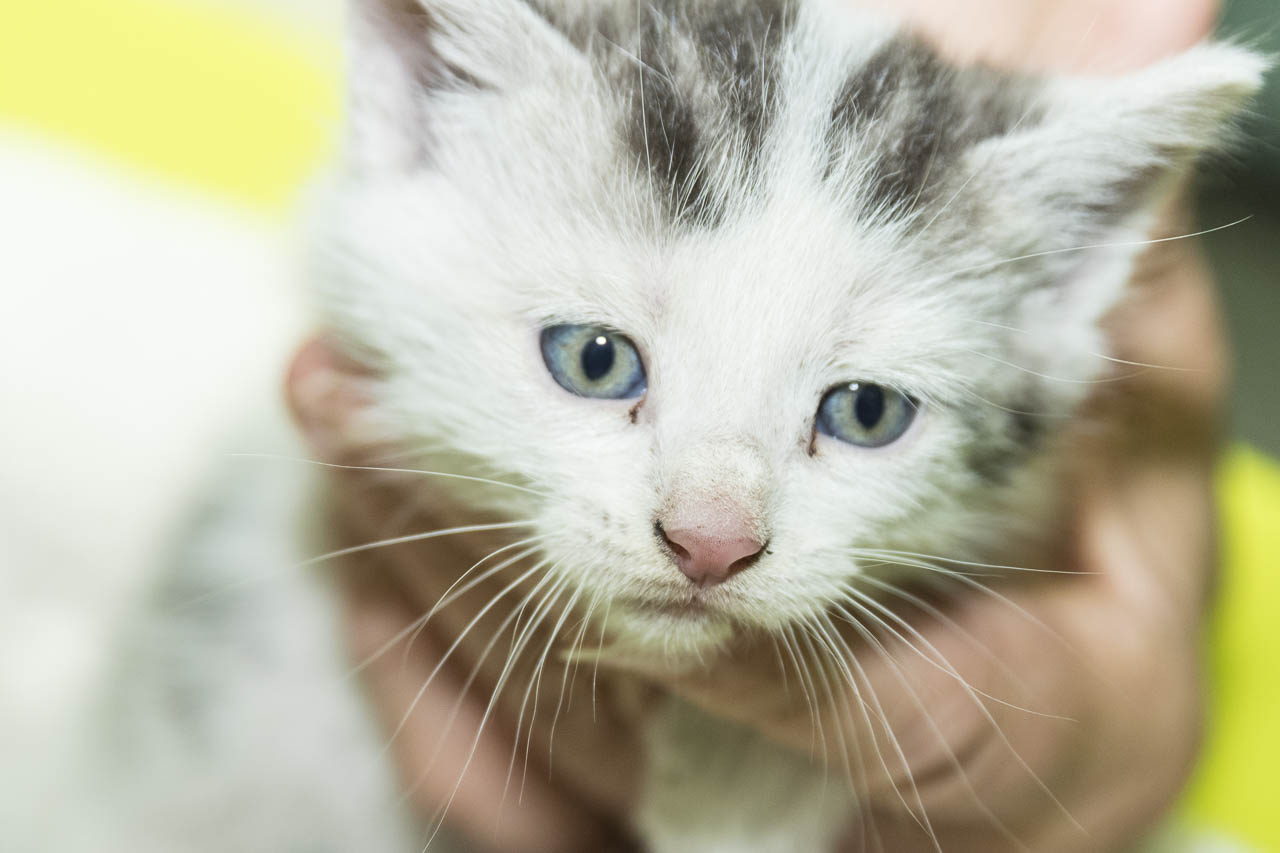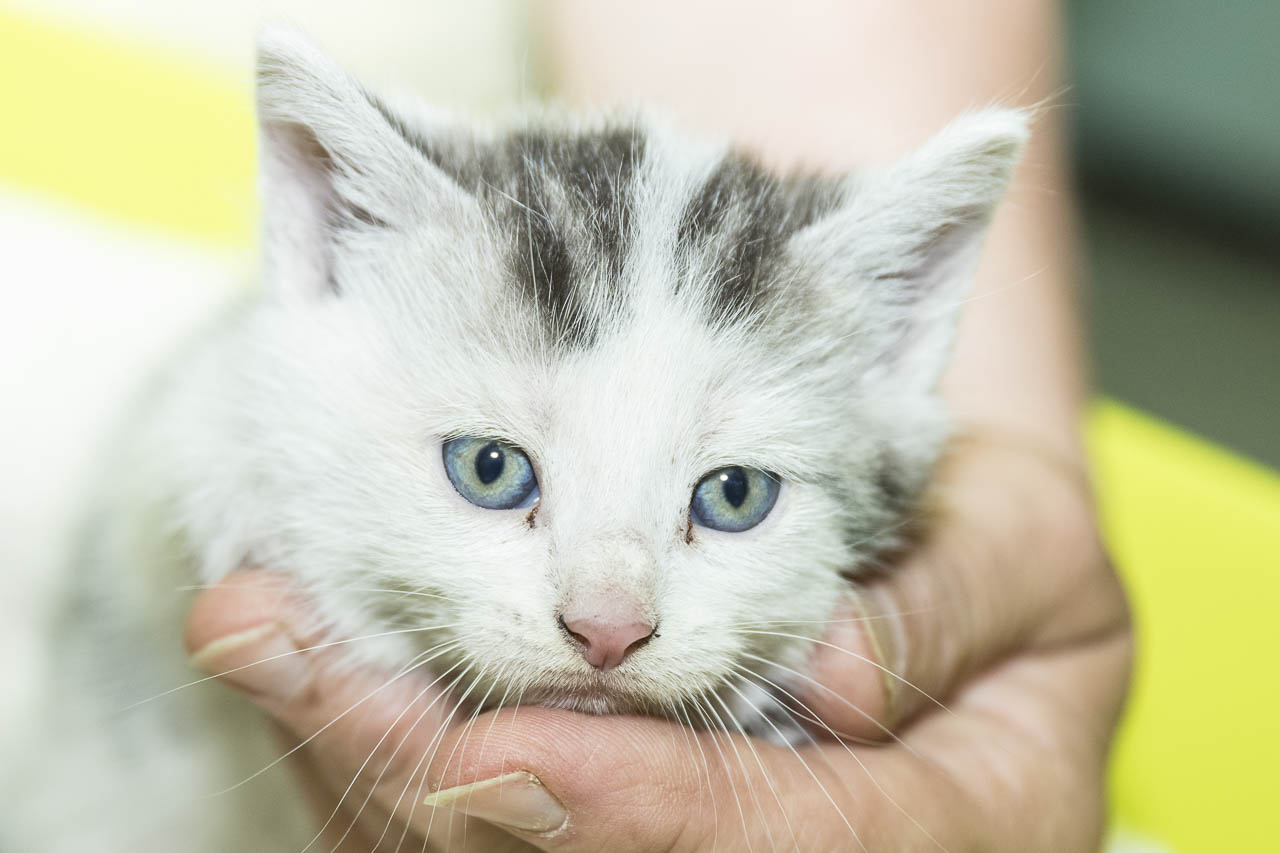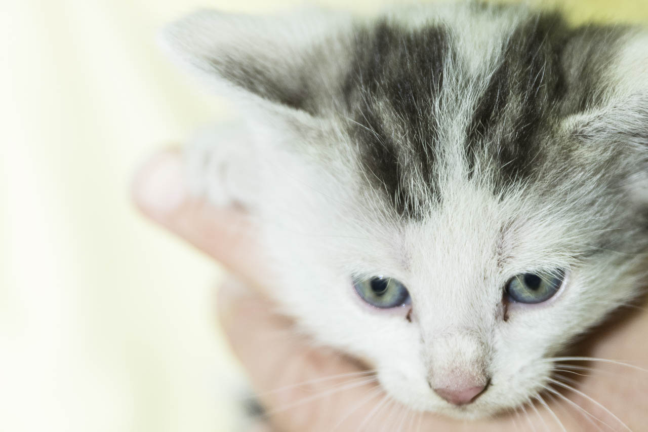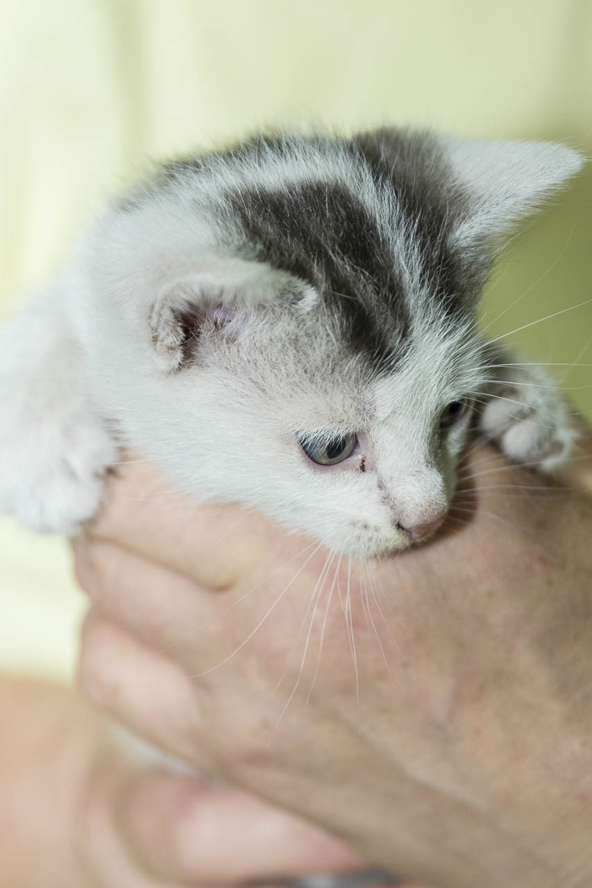 Das grau-weiße Kitten mit den dunkleren Öhrchen ist ein Mädchen.