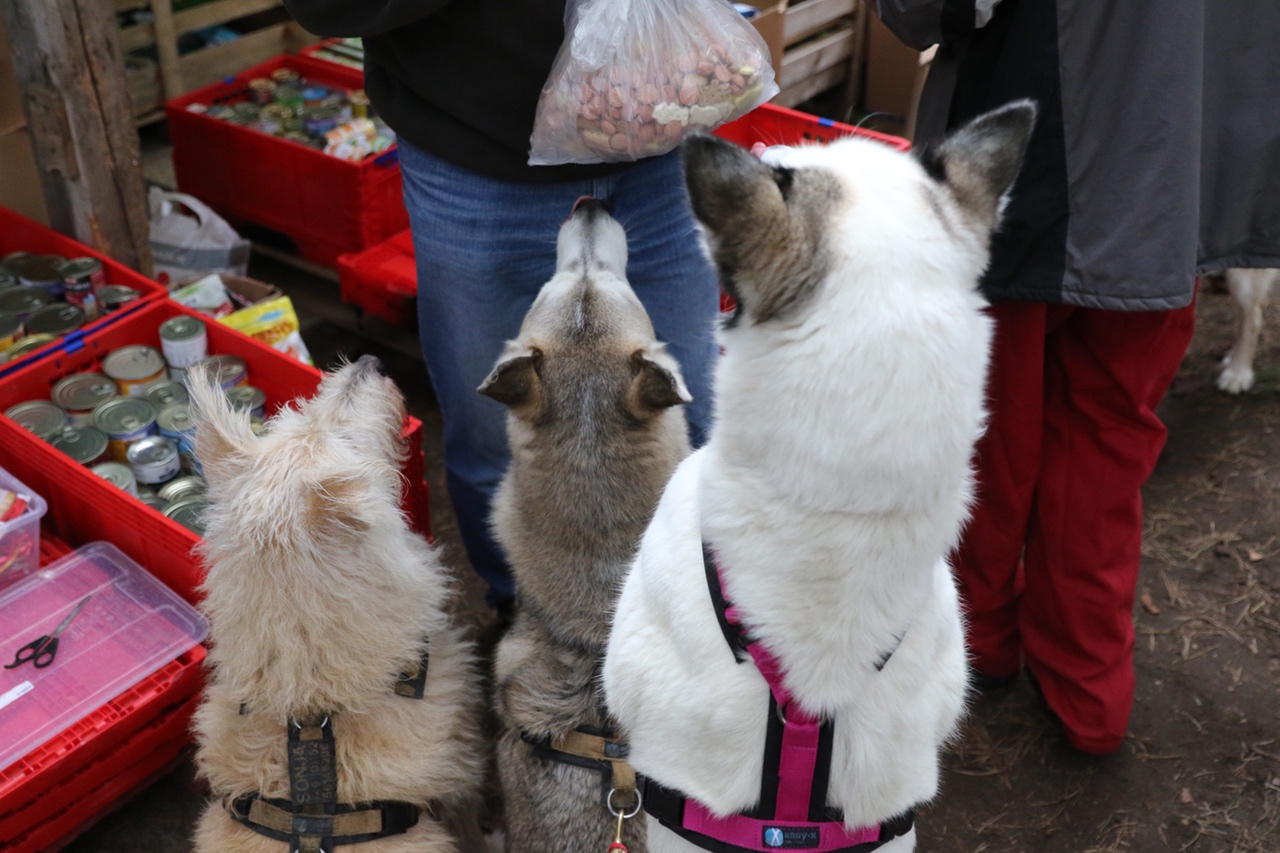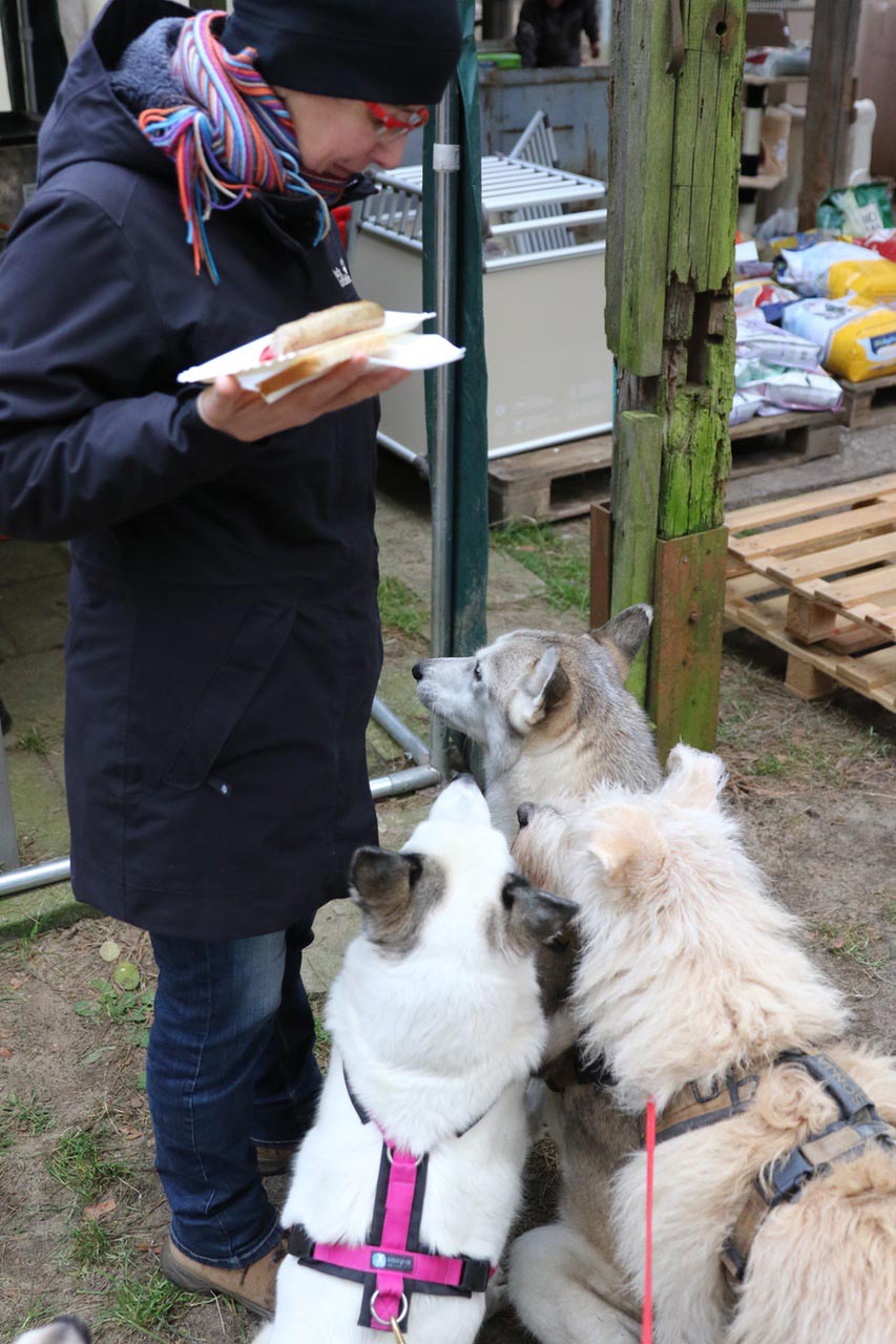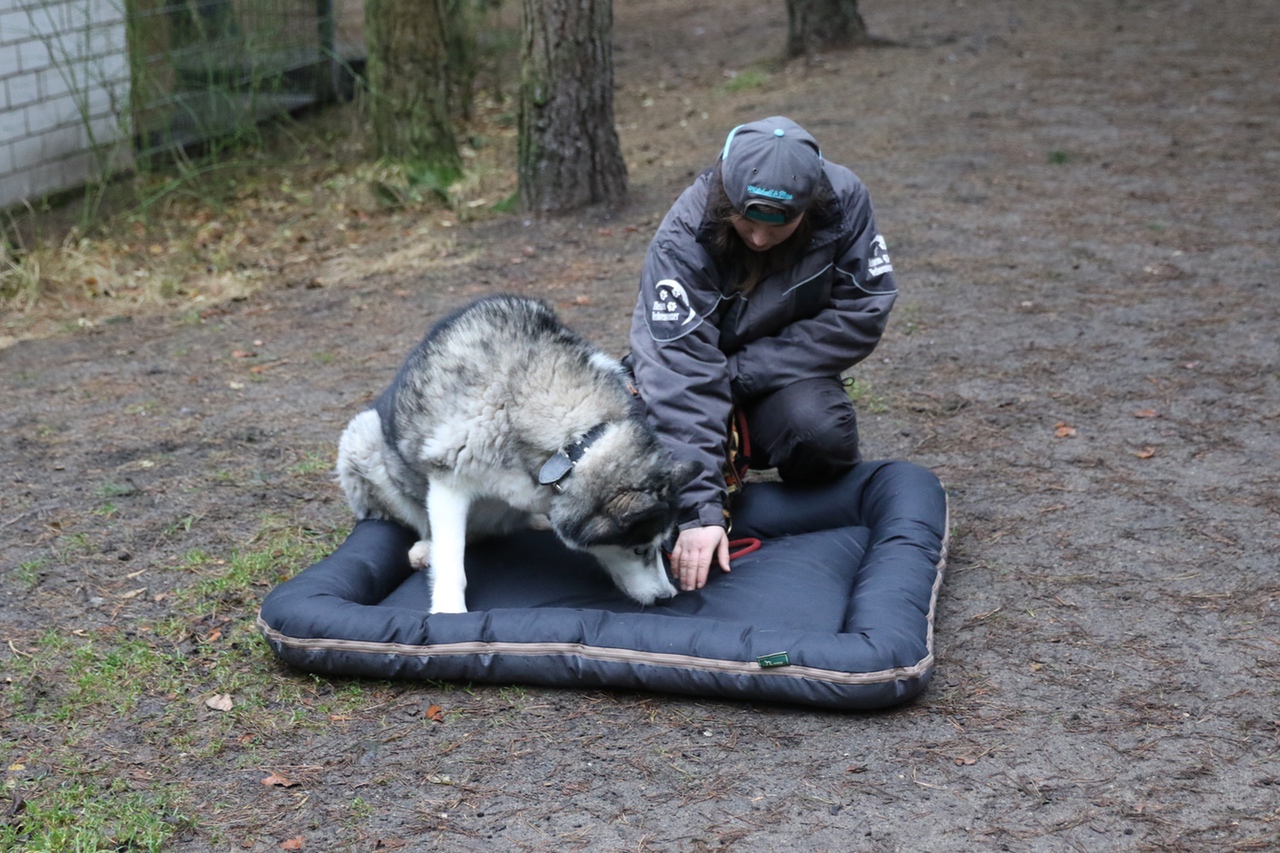 Einige Post-Pakete waren noch nicht ausgepackt, darunter eine große Lieferung für Yupek. Er bekam von Tierfreundin Steffi eine eigene schöne neue Ausstattung. Das Bett wurde von Yupek gleich nach dem Auspacken in Augenschein genommen und mit einem Husky-Lied begrüßt.