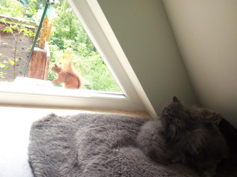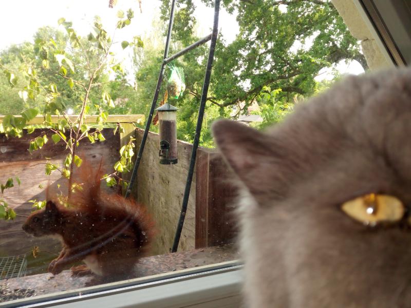Die Katzen der Familie finden die Vogelschar und die Eichkätzchen auch überaus interessant. Die Vögei stören sich schon lange nicht mehr daran, wenn die grauen Kater hinter der Glasscheibe sitzen.