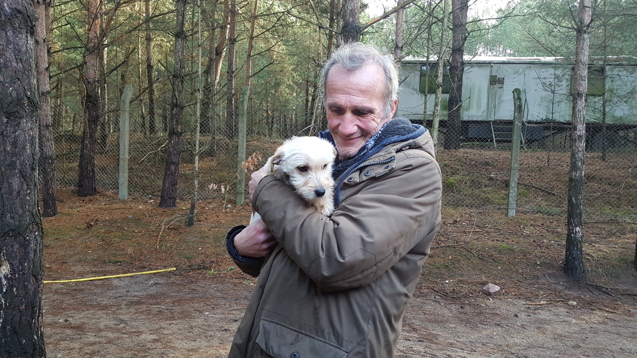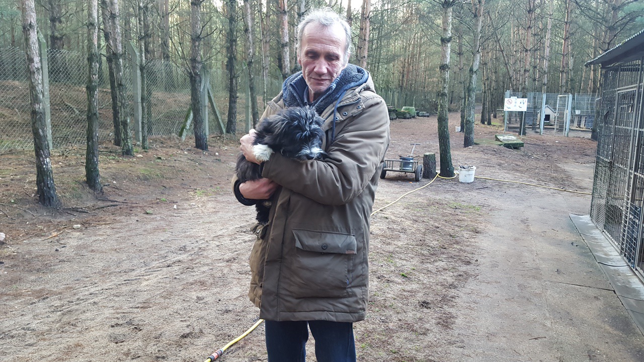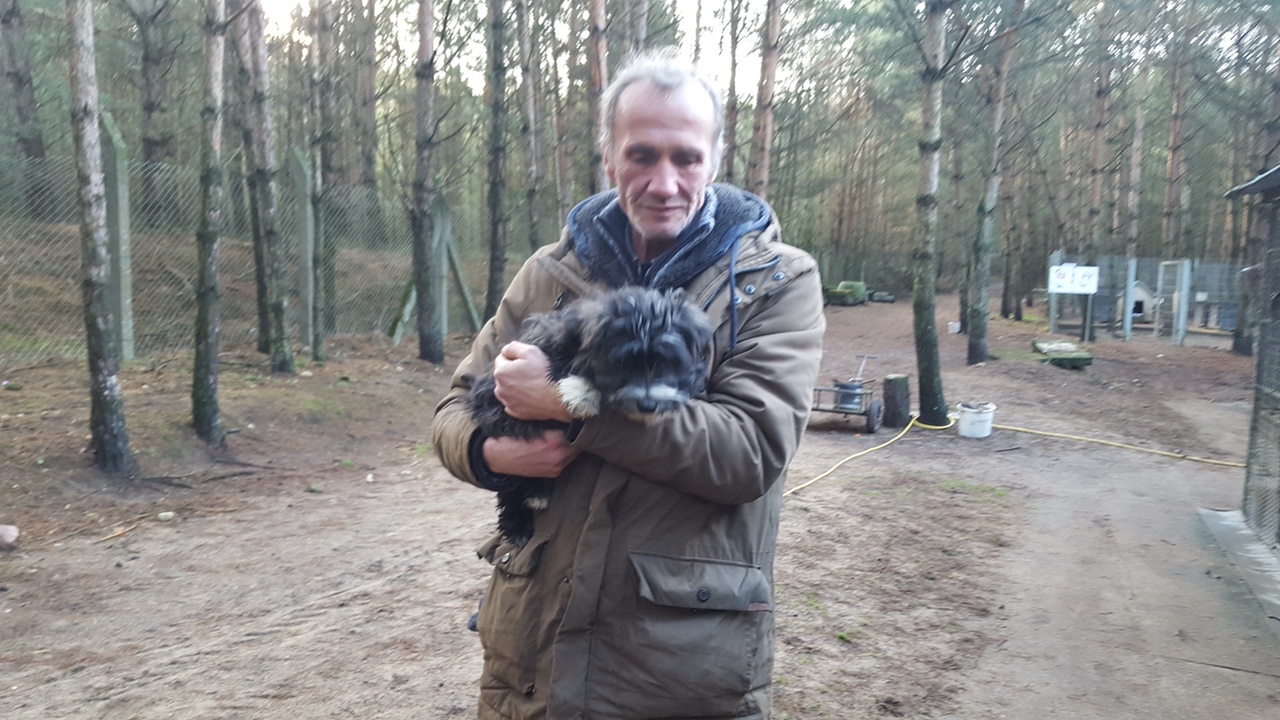 Bei unserem Ehrenamtler Clemens auf dem Arm sitzt eine helle beigefarbene Hündin. Der schwarze Welpe mit der weißen Brust ist ein Rüde. Die Strubbeline mit hellen Haaren um die Nase herum ist ein Welpenmädchen.
