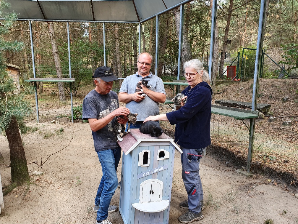 Tierheimleiter Maciej (mit Basecap), Dolmetscher Michael und unsere Tierpflegerin Ilona weihten dann auch gleich ein Katzen-Häuschen ein, dass wir just von einem Fressnapf in Berlin gespendet bekommen hatten.