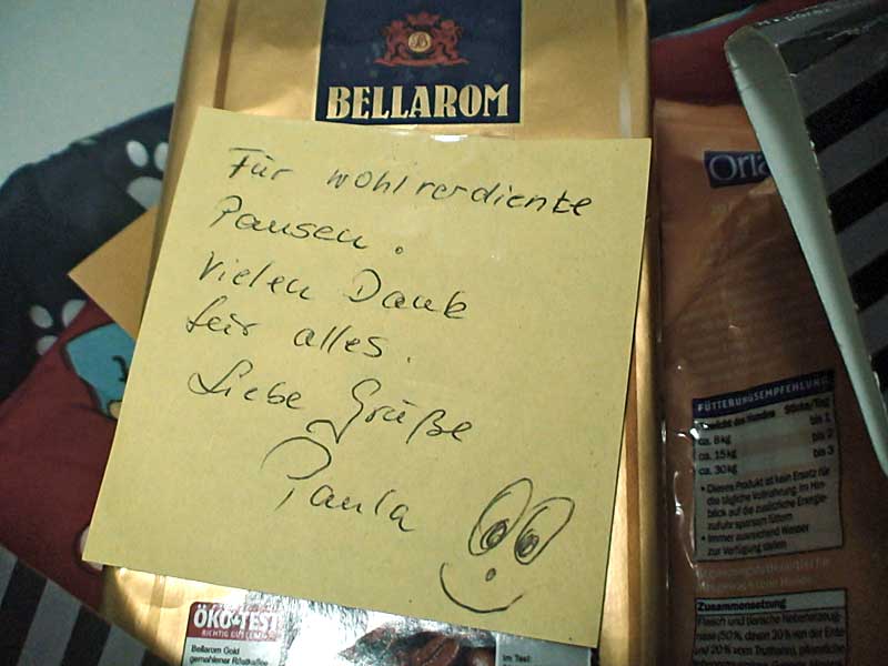 Wie schon bei anderen Paketen waren wir angenehm überrascht, dass auch "Pflegerfutter" dabei lag. Unsere Mitarbeiter freuen sich natürlich sehr über solche Gesten, denn der Alltag in einem Tierheim ist nicht immer leicht und erfordert vollen Einsatz. Da kommt solche Aufmunterung sehr recht.