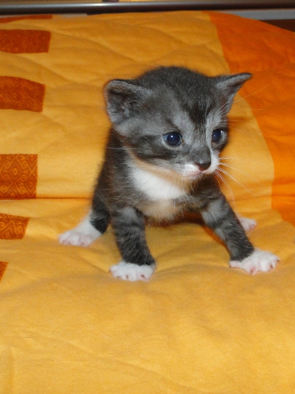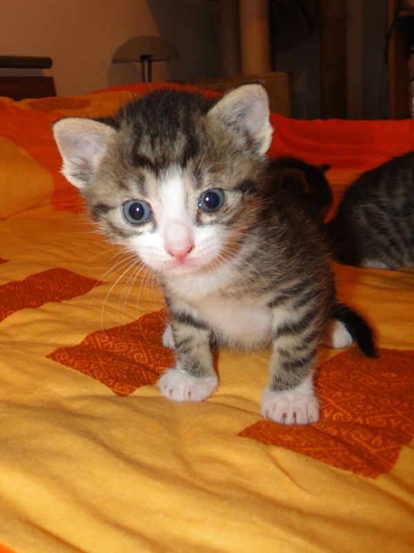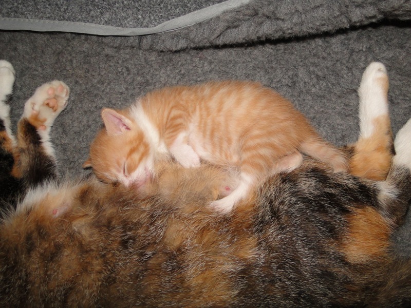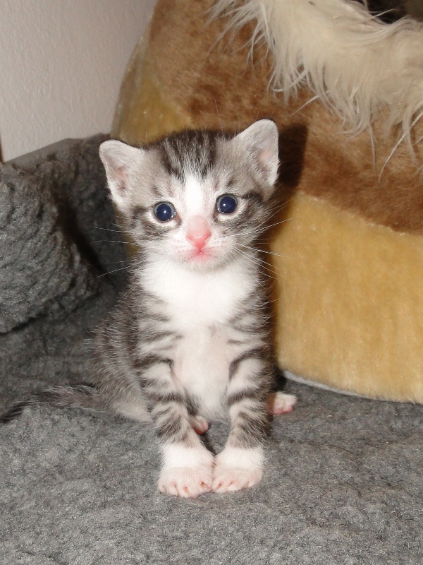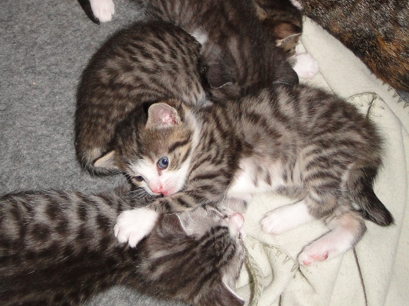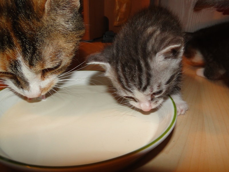 Und natürlich Fay als die Mama. Wer das Glück hat und dieser jungen Dame ein Zuhause geben darf, der hat einen Sechser im Lotto. Sie hat mittlererweile verstanden, wofür der Kratzbaum gedacht ist. Sie ist absolut stubenrein, springt nirgends drauf und hat bis jetzt keinerlei Unsinn im Kopf, was Katzen sonst so an sich haben. Was eigentlich auch schade ist, denn gewisser Unsinn bringt halt meist auch etwas Spannung mit sich. Nicht umsonst sagt man halt oft, dass Katzen ihren eigenen Kopf haben. Gut, ok, den hat sie auch, wenn es ums Kuscheln geht, denn das könnte sie stundenlang. Und wenn morgens bei mir der Wecker klingelt, dann stelle ich ihn meist so ein, dass er noch ein paar Mal klingelt. Das Klingeln ist allerdings der Startschuss für Fay, jetzt schmusen zu wollen. Aber immerhin wartet sie, bis der Wecker klingelt und tobt nicht Nachts durch die Gegend wie meine eigenen Katzen. Sehr sympathisch, muss ich ja zugeben. So, und nun lasse ich mal Bilder sprechen. Ach ja, da fällt mir ein: heute habe ich zum ersten Mal probiert, ob die Kleinen auch schon selbst aus dem Schüsselchen trinken, denn ihre Zähne sind draußen und traktieren die Mama ganz schön. Die ersten Versuche sind allerdings gescheitert. Ein Katerchen fand es zwar lecker, hat aber eher versucht, den Rand der Schüssel zu essen anstatt die Milch. Naja, ist ja noch kein Meister vom Himmel gefallen und mit ein bißchen Übung klappt das auch. Sie haben ja noch Zeit.