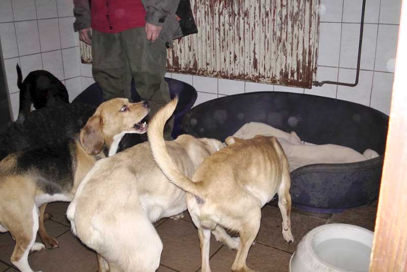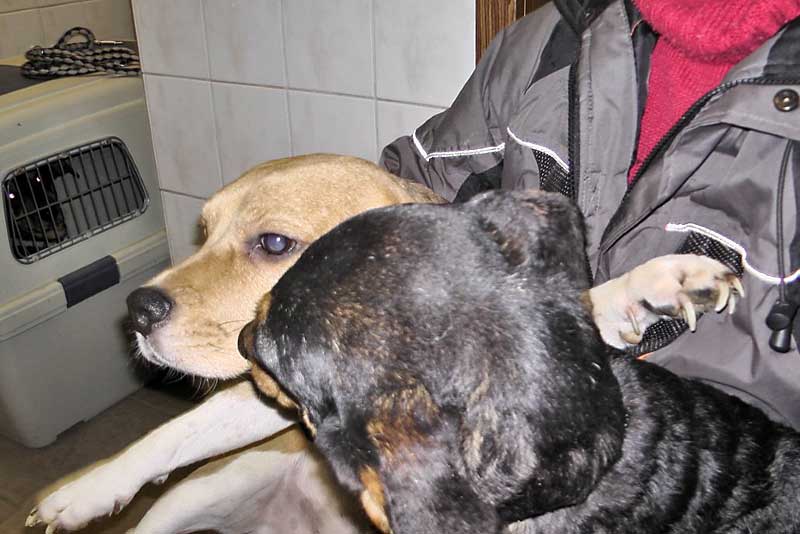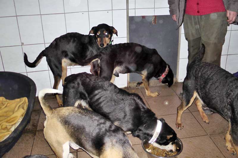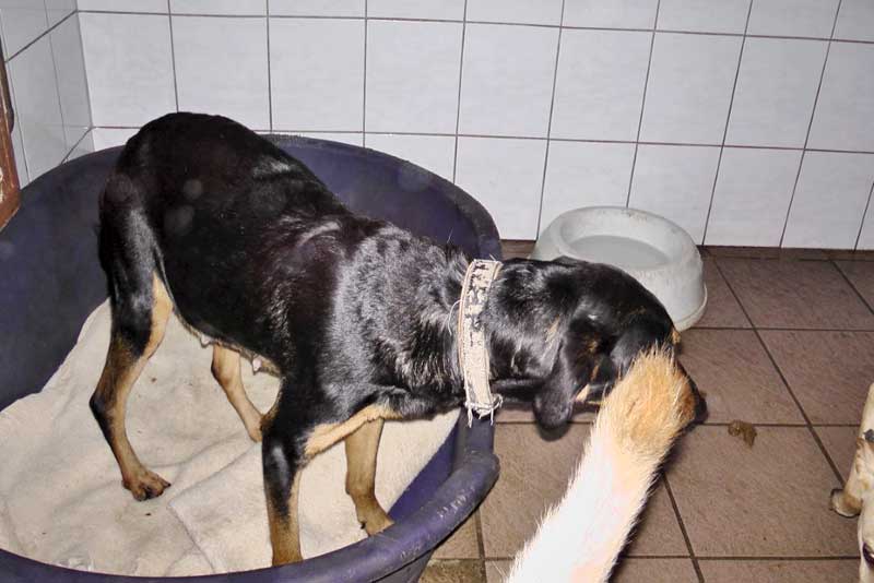Beim Ausladen aus dem Auto zeigte sich schon im Dunkeln, dass die Tiere in sehr schlechtem Ernährungszustand waren. Alle drei stürzten sich ausgehungert auf das angebotene Futter und ihr Durst war extrem. Aber die Tiere gierten nicht nur nach Futter, sondern nach jeder Zuwendung. Sie umfingen und umklammerten den Tierheimleiter, so dass er sich kaum noch bewegen konnte. Er bezog also mit den Hunden ein Zimmer im Tierheim, um sie nicht allein zu lassen.