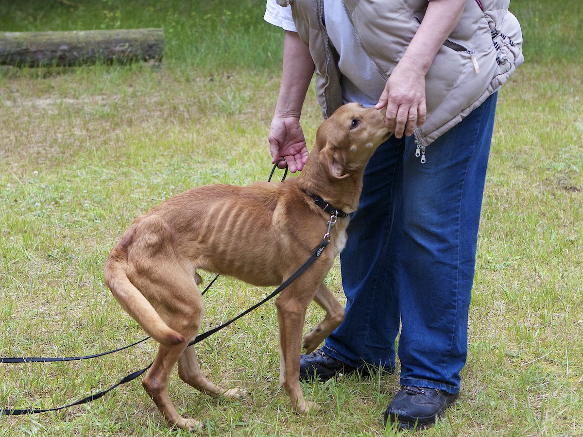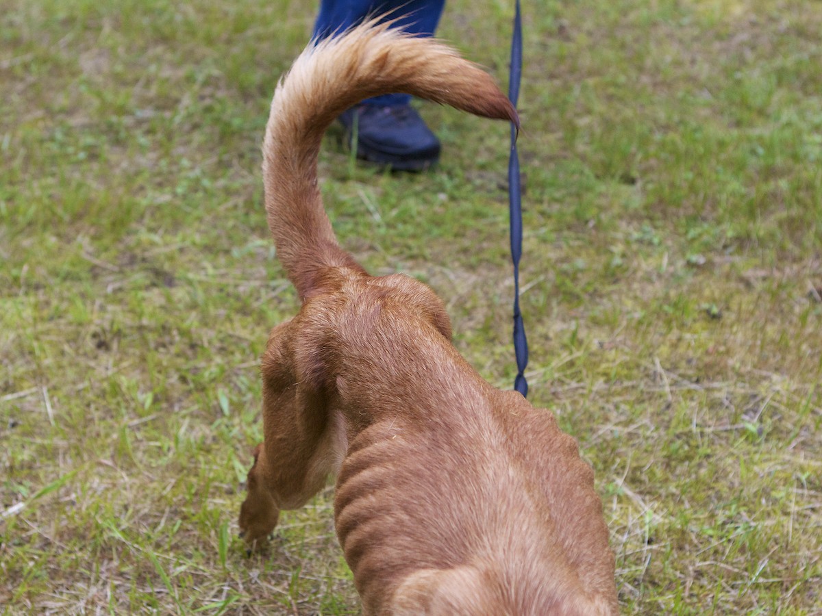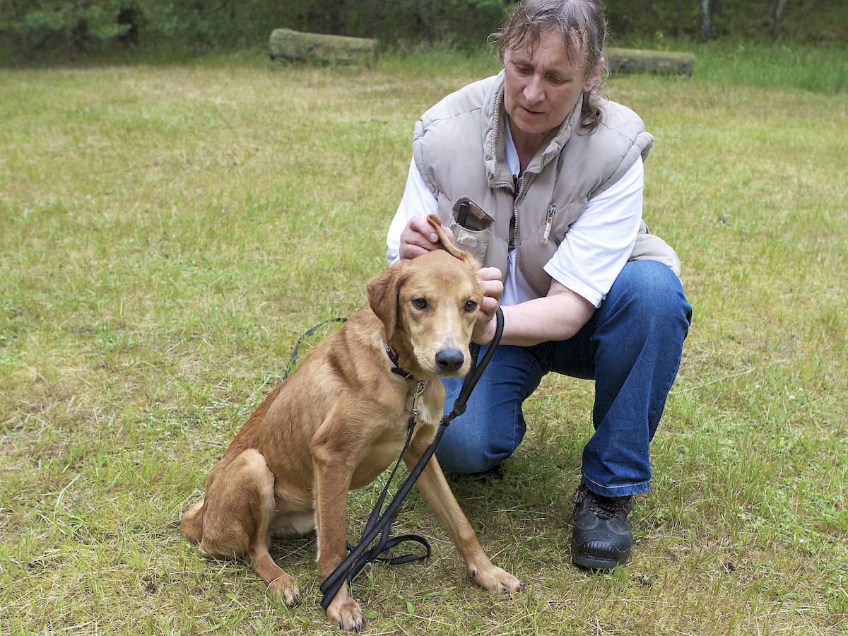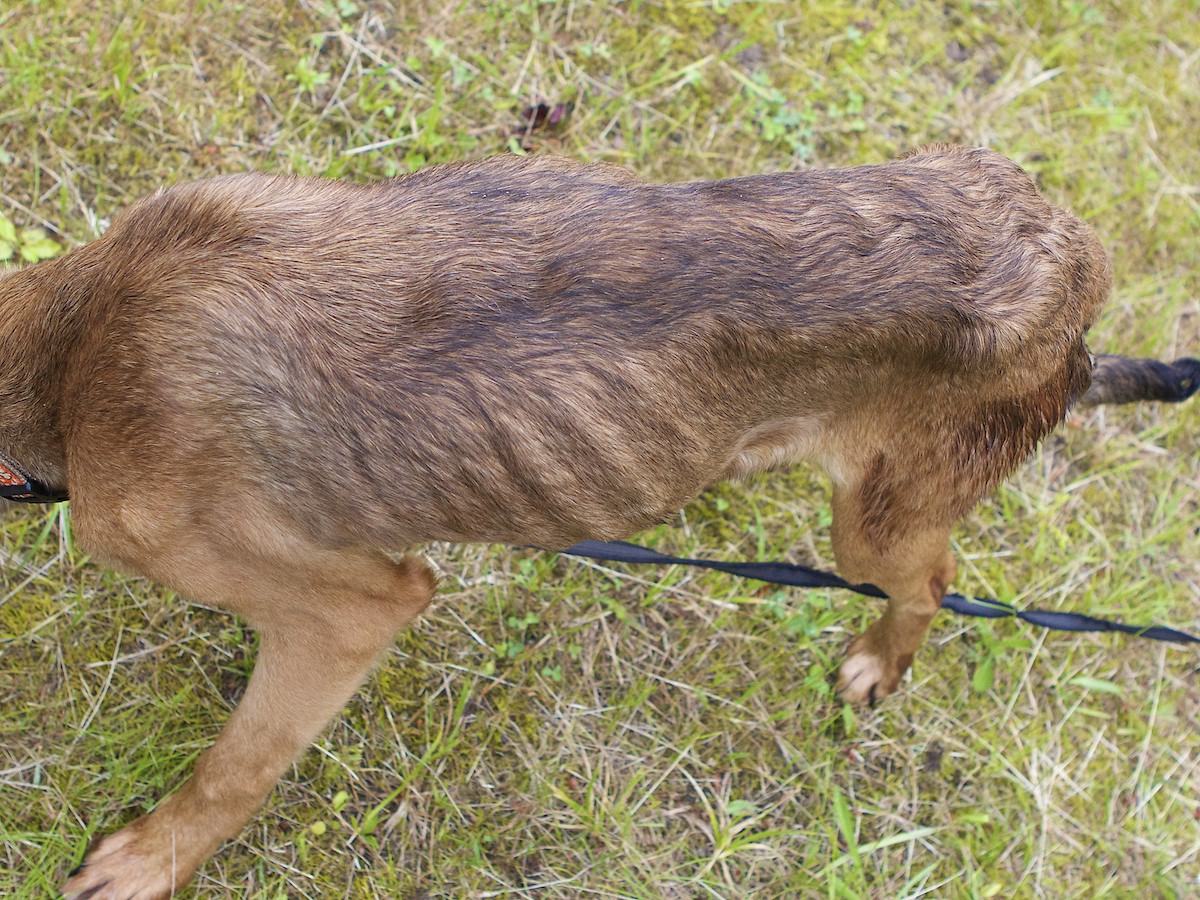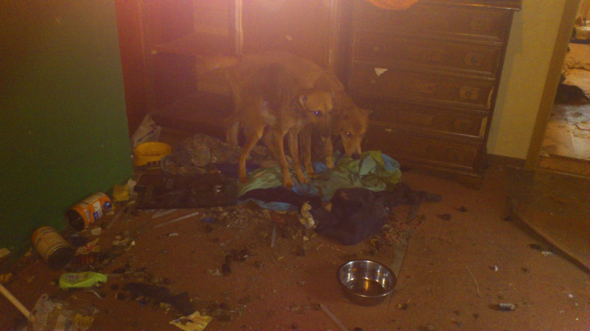 Eine Dame vom Sozialdienst hatte mitbekommen, dass in der Wohnung zwei Hunde zurückgeblieben waren. Sie rief uns an und bat um Abholung der Hunde. Als unsere Mitarbeiterin eintraf, betraten sie gemeinsam die Räume: eine vermüllte und verdreckte Messie-Wohnung, wie man sie sonst nur aus dem Fernsehen kennt, überall Kot und Abfall, bestialischer Gestank und zwei Hunde, die sich ängstlich an den Schrank pressten. Erst beim Näherkommen stellten die beiden Frauen fest, dass die Hunde sich gar nicht anders bewegen konnten, denn sie waren an einer nur wenige Zentimeter langen Kette am Schrank angekettet. Beide Hunde bestanden nur noch aus Haut und Knochen.