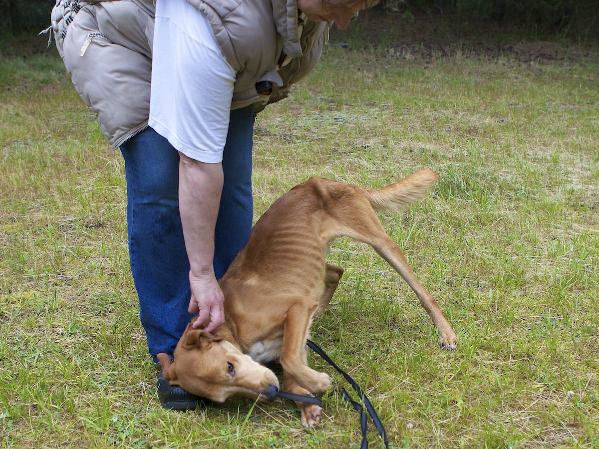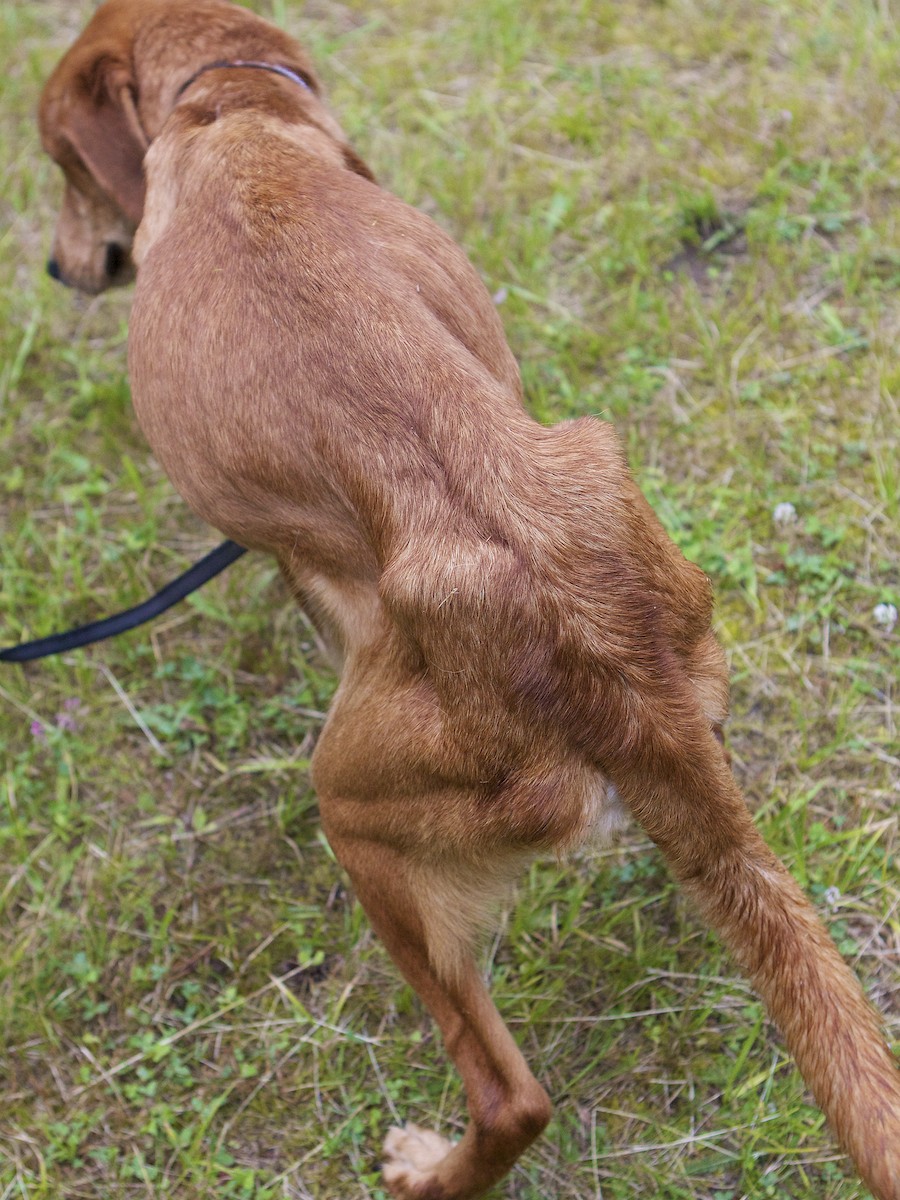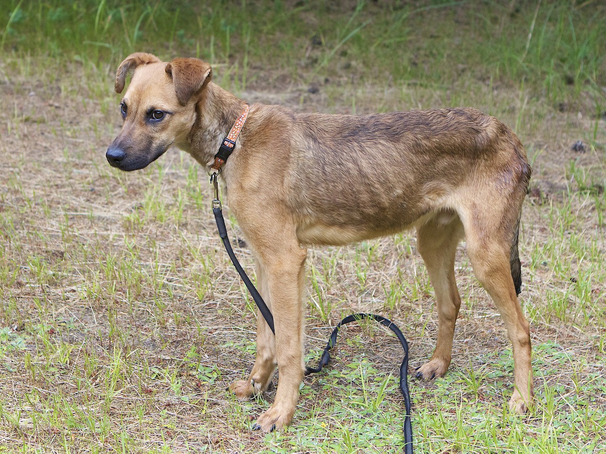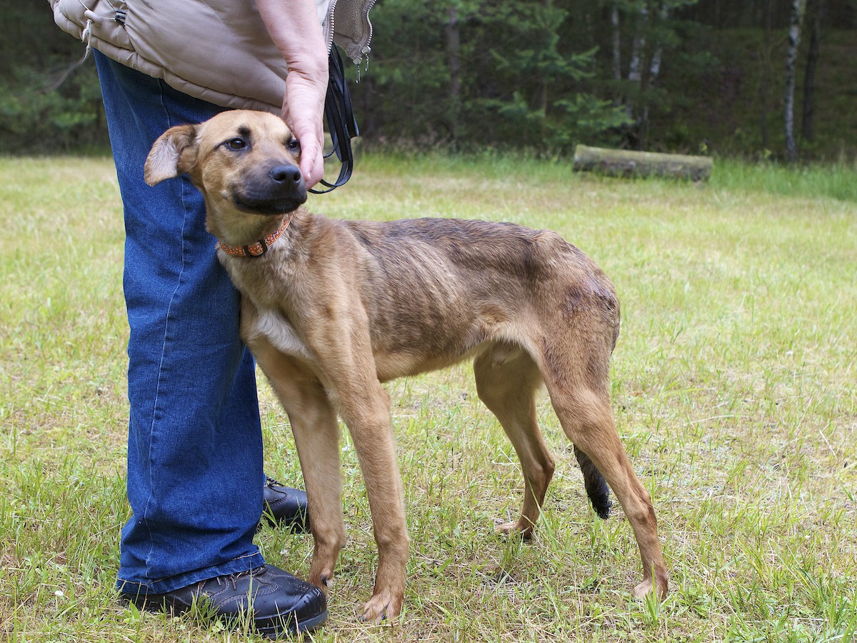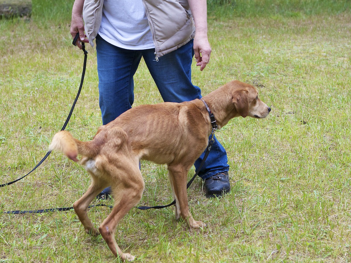 Eine Dame vom Sozialdienst hatte mitbekommen, dass in der Wohnung zwei Hunde zurückgeblieben waren. Sie rief uns an und bat um Abholung der Hunde. Als unsere Mitarbeiterin eintraf, betraten sie gemeinsam die Räume: eine vermüllte und verdreckte Messie-Wohnung, wie man sie sonst nur aus dem Fernsehen kennt, überall Kot und Abfall, bestialischer Gestank und zwei Hunde, die sich ängstlich an den Schrank pressten. Erst beim Näherkommen stellten die beiden Frauen fest, dass die Hunde sich gar nicht anders bewegen konnten, denn sie waren an einer nur wenige Zentimeter langen Kette am Schrank angekettet. Beide Hunde bestanden nur noch aus Haut und Knochen.