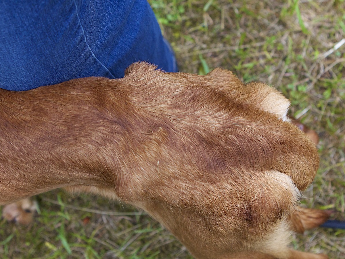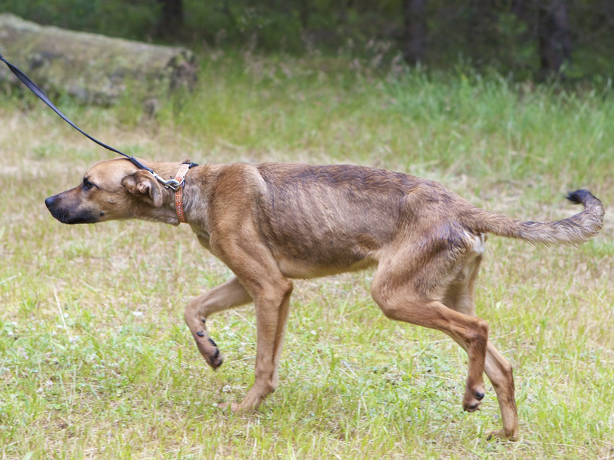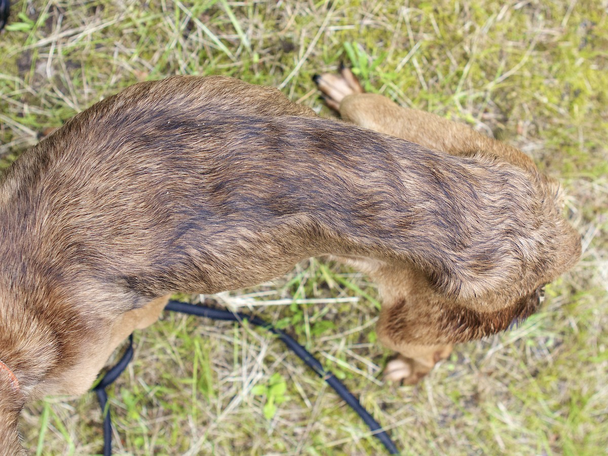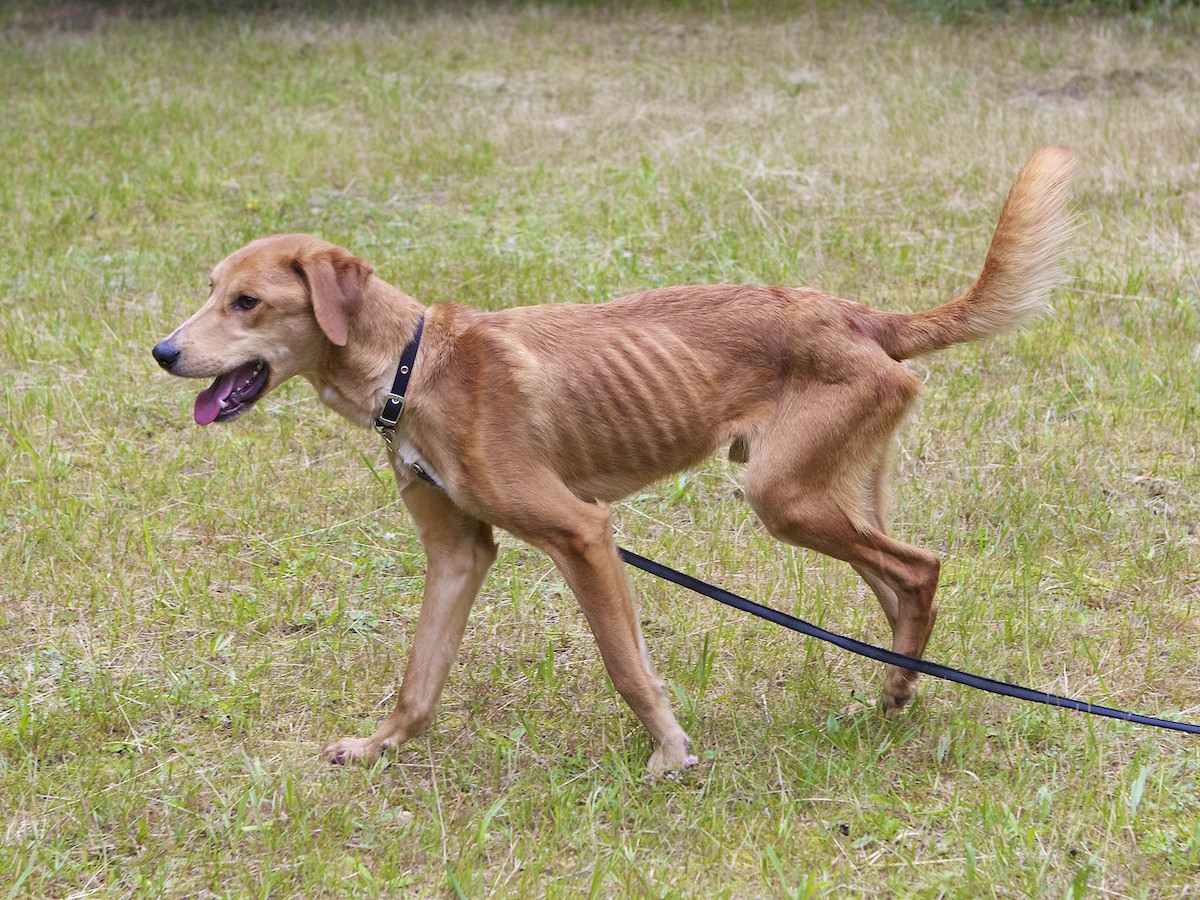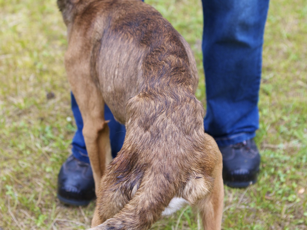 Eine Dame vom Sozialdienst hatte mitbekommen, dass in der Wohnung zwei Hunde zurückgeblieben waren. Sie rief uns an und bat um Abholung der Hunde. Als unsere Mitarbeiterin eintraf, betraten sie gemeinsam die Räume: eine vermüllte und verdreckte Messie-Wohnung, wie man sie sonst nur aus dem Fernsehen kennt, überall Kot und Abfall, bestialischer Gestank und zwei Hunde, die sich ängstlich an den Schrank pressten. Erst beim Näherkommen stellten die beiden Frauen fest, dass die Hunde sich gar nicht anders bewegen konnten, denn sie waren an einer nur wenige Zentimeter langen Kette am Schrank angekettet. Beide Hunde bestanden nur noch aus Haut und Knochen.
