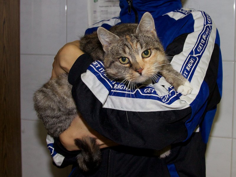 Eine der Katzen, die wir übernommen haben, war verletzt. In die unbehandelten offenen Wunden war Katzenstreu eingewachsen. Die andere Katze ist trächtig.