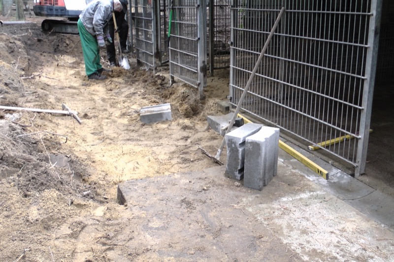 Eigentlich wollten wir nur neue Rinnen verlegen. Doch die Wurzeln der Bäume haben die Gehwegplatten hochgedrückt und z.T. zerbrochen. Bis in die Zwinger hinein waren die Böden kaputt. Also alles raus und neu machen.