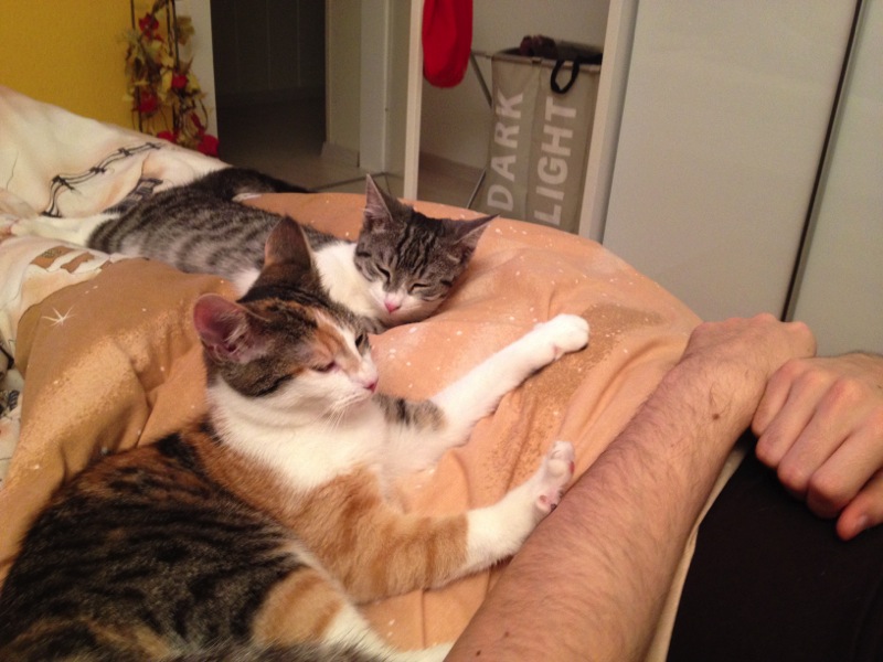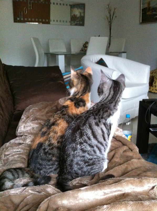 Und anfangs fanden wir die vielen Zimmer in unserem neuen Zuhause auch sehr unheimlich und haben uns erst einmal unter dem Bett im Schlafzimmer versteckt. Am Abend sind wir aber schon hervorgekommen und haben mit unseren neuen Herrchen geschmust. Überrascht hat uns dabei vor allem so ein komisches Fenster in der Wand, in dem sich alles ganz schnell geändert hat (Fernseher)! Mittlerweile finden wir das aber gar nicht mehr so spannend. Viel besser finden wir ja die Maus auf der Pyramide, die wir noch von unserem alten Zuhause kennen. Die lässt sich immer noch nicht fangen! Insgesamt fühlen wir uns jetzt schon pudelwohl hier und toben durch die Wohnung. Wir haben fast gar keine Angst mehr vor unbekannten Geräuschen und kuscheln und spielen sehr viel mit Bine und Chris. Am Wochenende soll ein Mann kommen, der ein Netz an der Terrasse anbringt, damit wir jederzeit raus können. Dann sollen wir auch noch einen größeren Kratzbaum vom dem bekommen! Darauf freuen wir uns schon sehr!