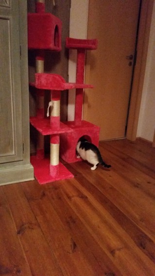 Ich find es toll hier – ein Kratzbaum (in Pink!), eine Höhle, ein Kuschelkissen und