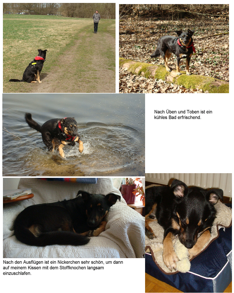 Leroy ist ein ganz lieber Geselle, mit dem wir viel Freude haben und der in unserem Wohnumfeld auch von vielen Nachbarn gern gesehen wird. Anfangs hatte er mit anderen Hunden nicht so viel im Sinn. Jetzt fordert er den einen oder anderen Artgenossen zum gemeinsamen Spiel auf. Er hat eigentlich nur eine "Schwäche," die wir ihm unbedingt abgewöhnen müssen: Er geht oft zu anderen Menschen, egal, ob mit oder ohne Hund. Dabei ist er nie aggressiv, sondern nähert sich den Leuten freundlich und schwanzwedelnd. Nun gibt es (gerade in Berlin?) viele Menschen, die Hunde nicht mögen oder gar Angst haben. Dies haben wir zweifelsohne zu akzeptieren und müssen dagegen steuern, damit es nicht zu unangenehmen Begegnungen kommt. Mit Joggern und Radfahrern gibt es zum Glück keine Probleme. Notfalls nehmen wir Leroy jetzt an die Leine, selbst in den Auslaufgebieten (s. auch nächsten Absatz). In der Straßenlandschaft Berlins bleibt Leroy ohnehin stets angeleint.