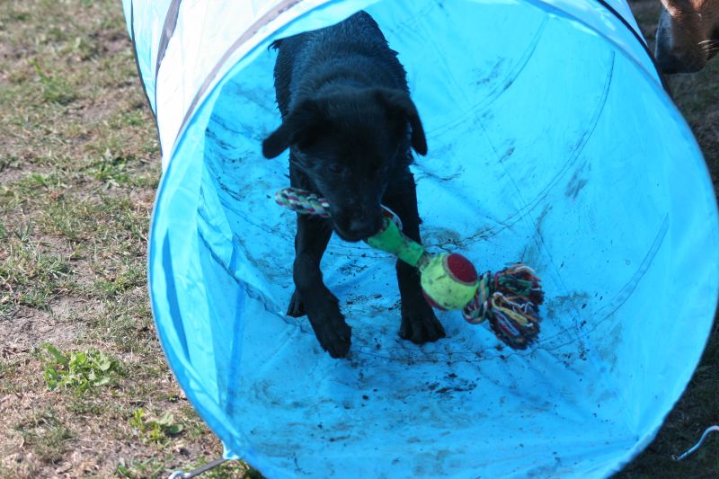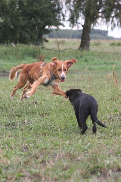 Am meisten Spass macht es Daim in die langen Setterohren zu beissen und dran ziehen und schwupp hat man ihn auch schon zum Spielen animiert... Dann wohnen bei uns noch Katzen, da habe ich ganz schnell gelernt, dass ich diese nicht jagen sollte, die drehen sich rasend schnell um und knallen mir eine - das zeckt ganz schön...