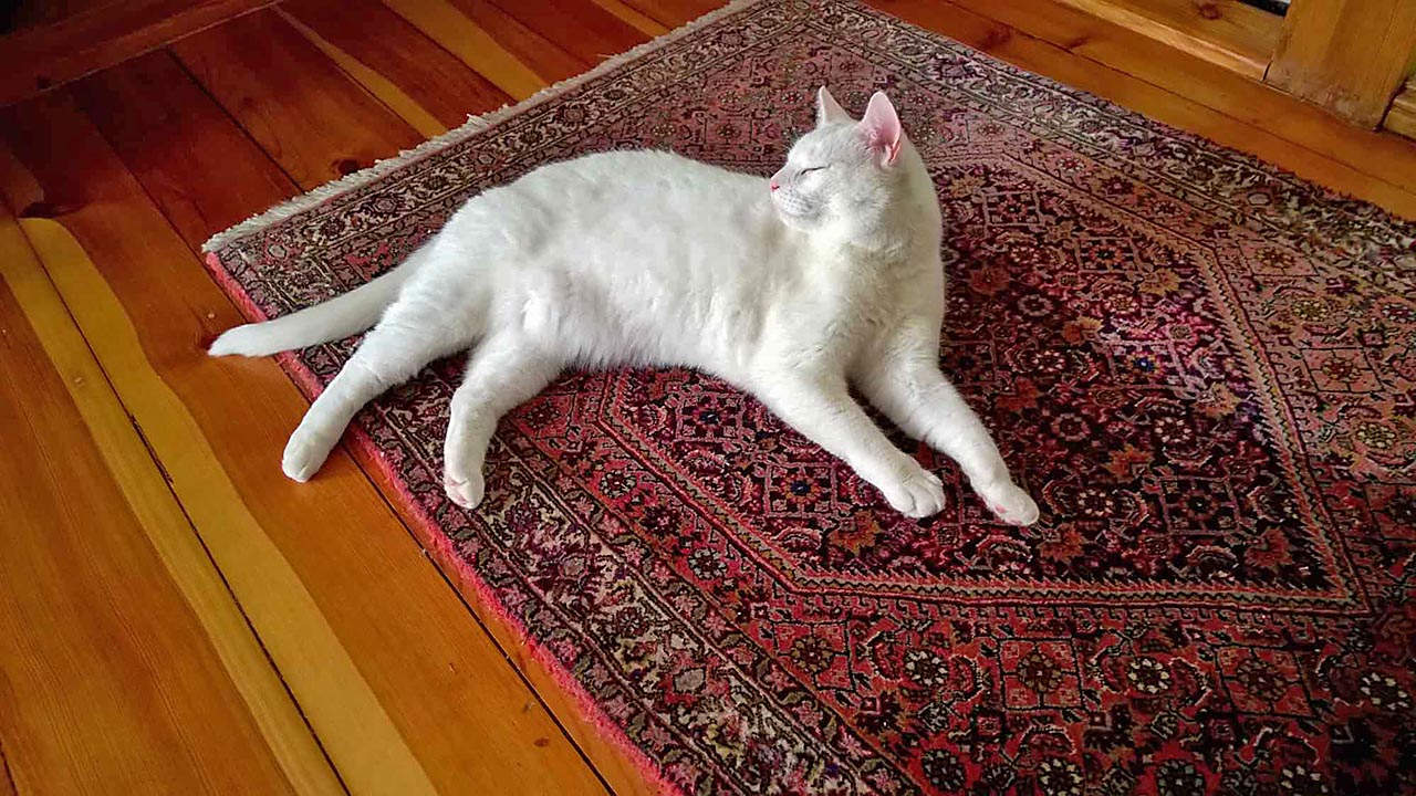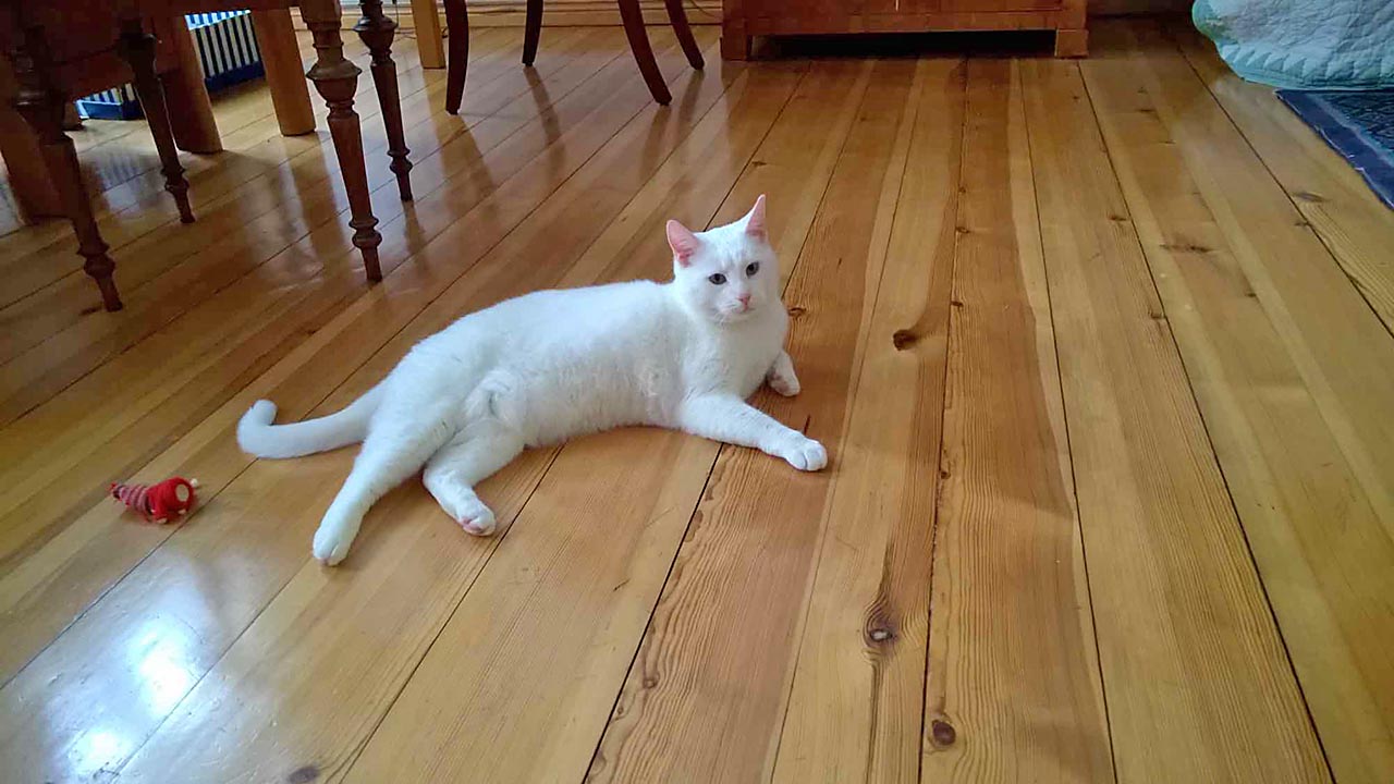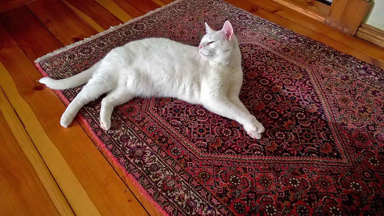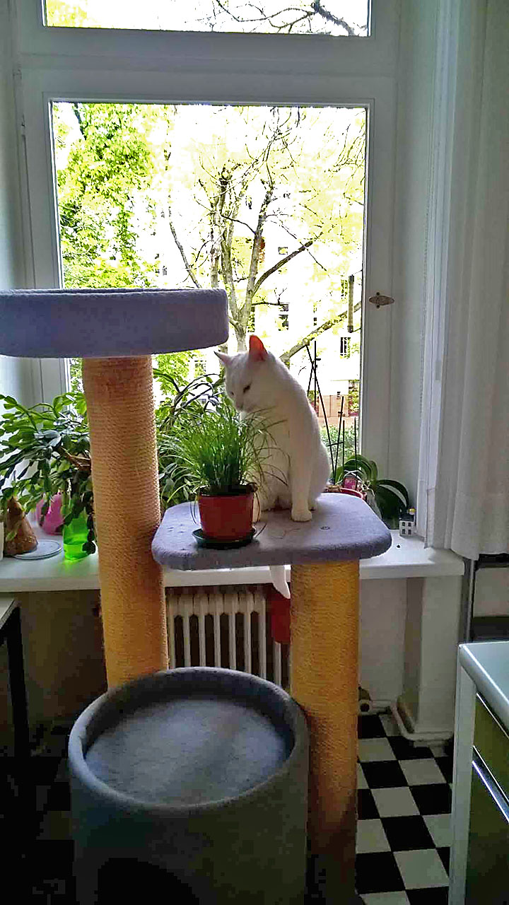 Sie rennt durch die Wohnung und hat auch mehrere Ruheplätze gefunden. Ich spiele oft mit ihr, um ihr etwas Bewegung zu verschaffen. Sie sitzt gern auf dem Kratzbaum in der Küche, schaut den Vögeln zu (sehr aufgeregt mit klappernden Zähnen) und mir bei der Hausarbeit. Auch der Balkon (mit Katzennetz!) gefällt ihr gut. Gestern hat sie an mich gekuschelt stundenlang mit mir ferngesehen. Sie sitzt gern auf dem Schoß. Alles in allem, eine Traumkatze, wie auch Frau Ott sagt.