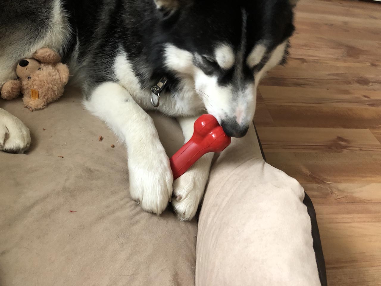 Besonders wird Euch freuen: Keine Kolateralschäden. Storm schafft es inzwischen locker alleine zu bleiben und sich mit viel Spielzeug gut zu beschäftigen..Somit hat er bis jetzt die schwierigste Aufgabe mit Bravour gemeistert.